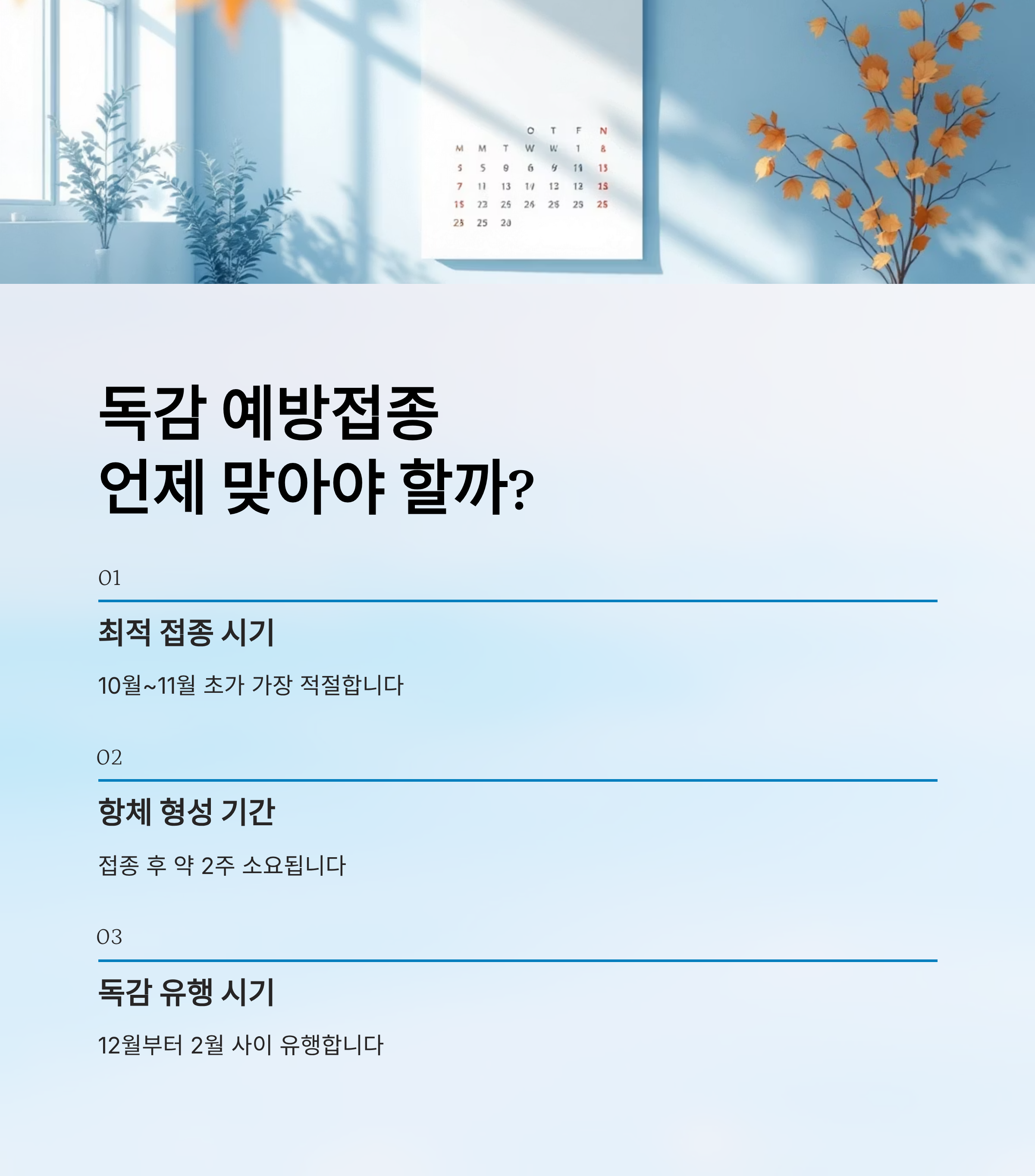 독감은 일반적으로 12월부터 2월 사이에 유행합니다. 가장 적절한 접종 시기는 10월~11월 초입니다.