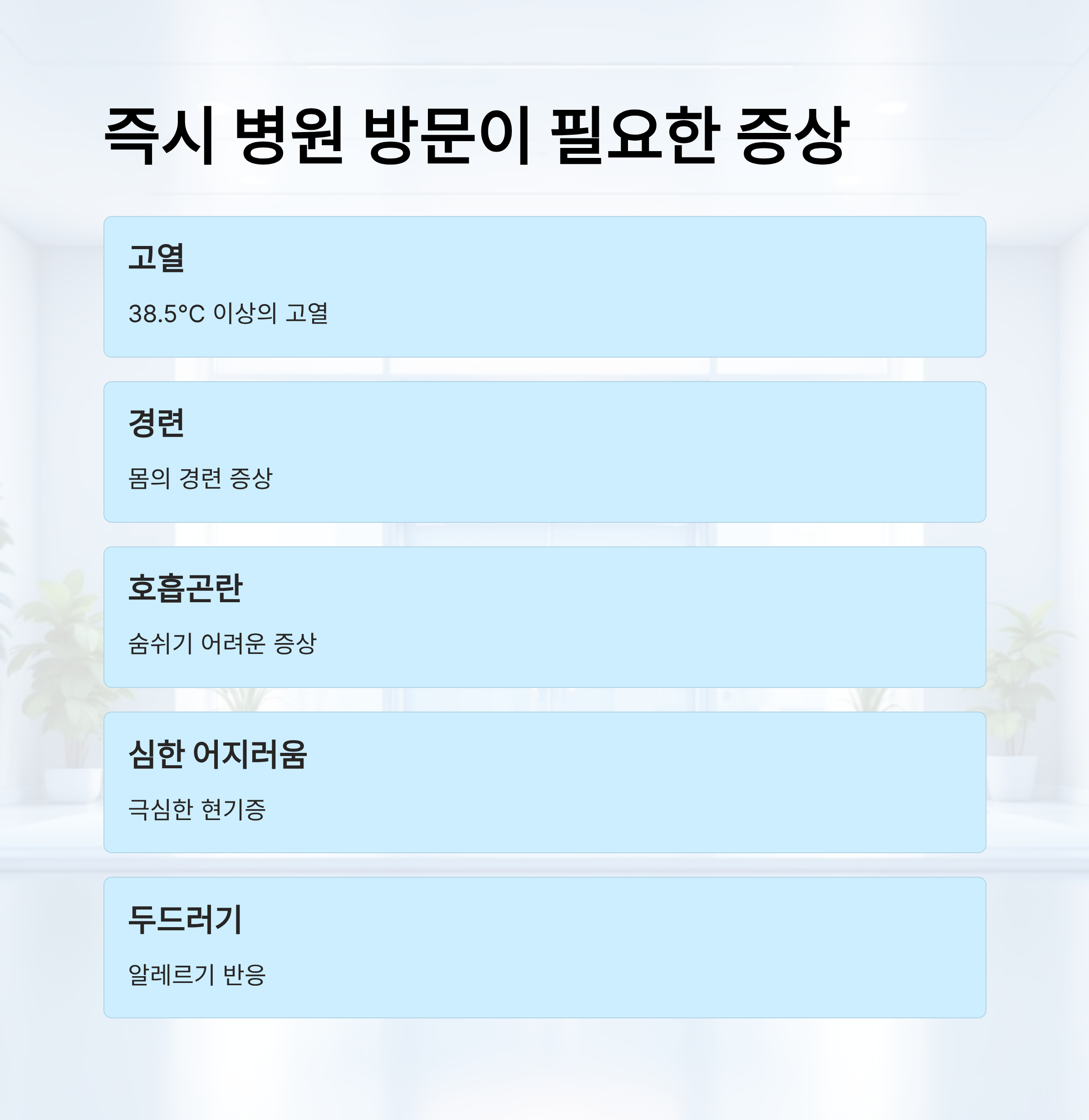 - 고열(38.5℃ 이상), 경련, 호흡곤란, 심한 어지러움, 두드러기