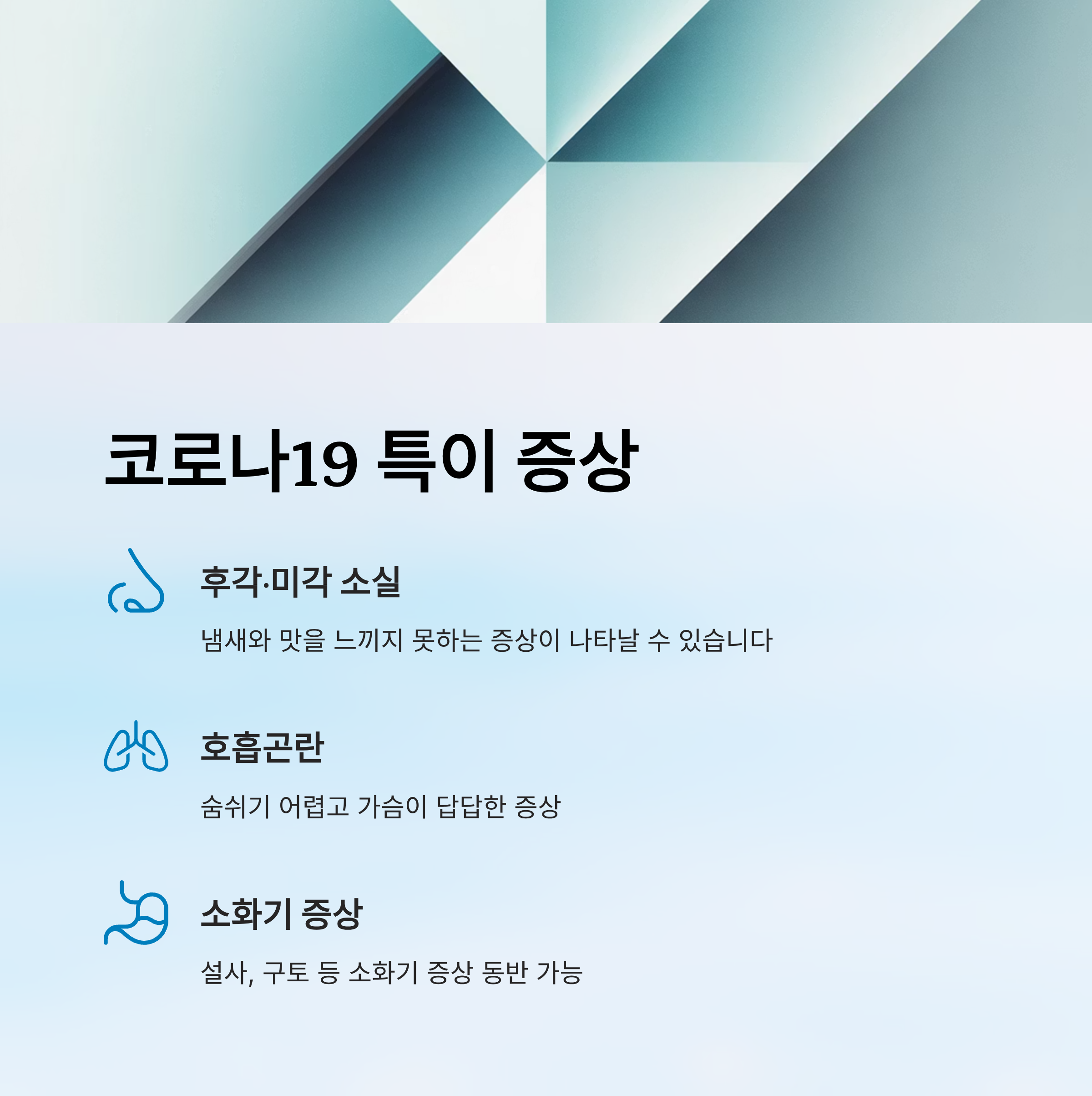 - 코로나19는 미각·후각 소실, 호흡기와 소화기 증상이 함께 나타날 수 있습니다.