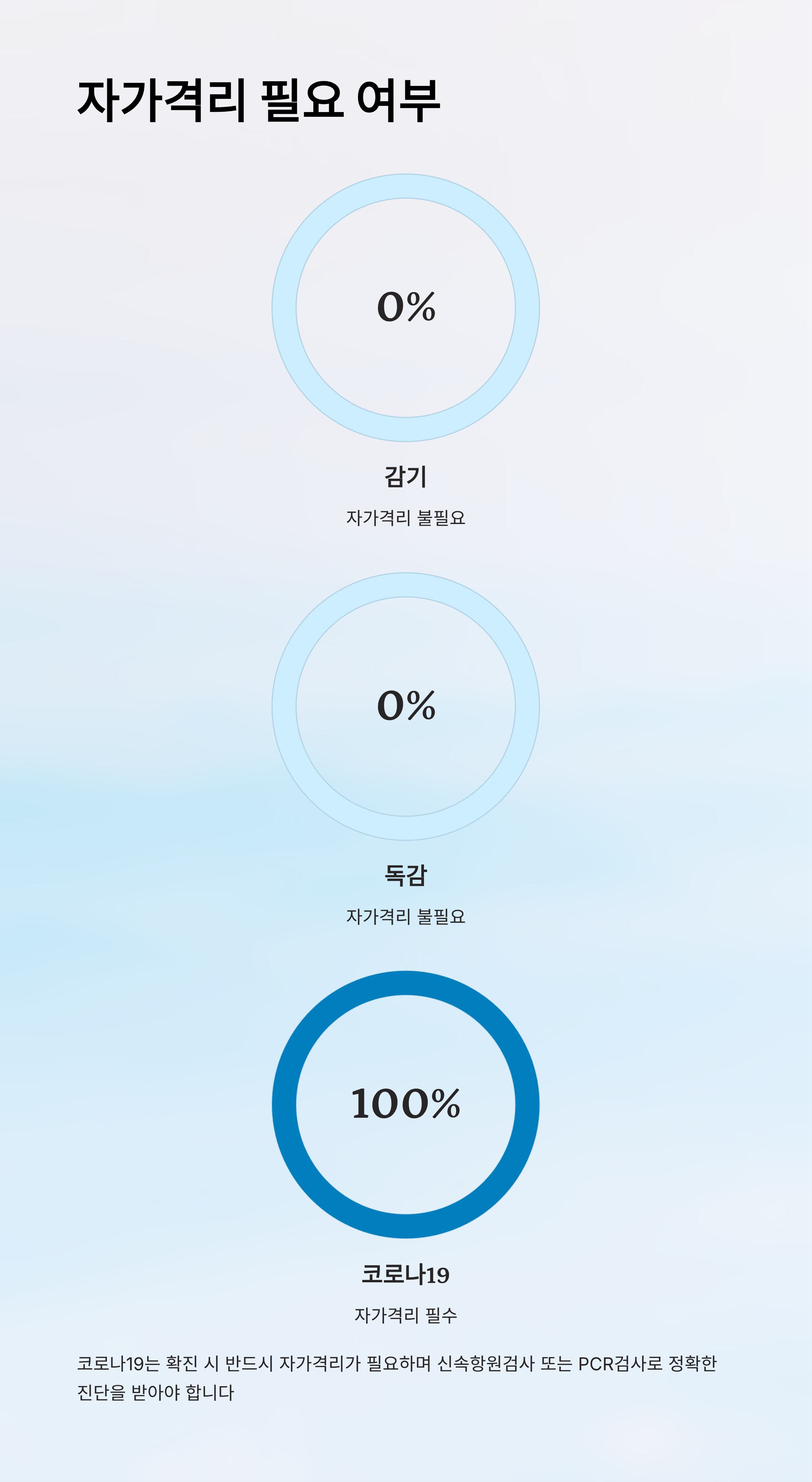 A2. 젊고 건강한 사람은 무증상 또는 경미할 수 있지만, 고위험군은 반드시 진료와 자가격리가 필요합니다.