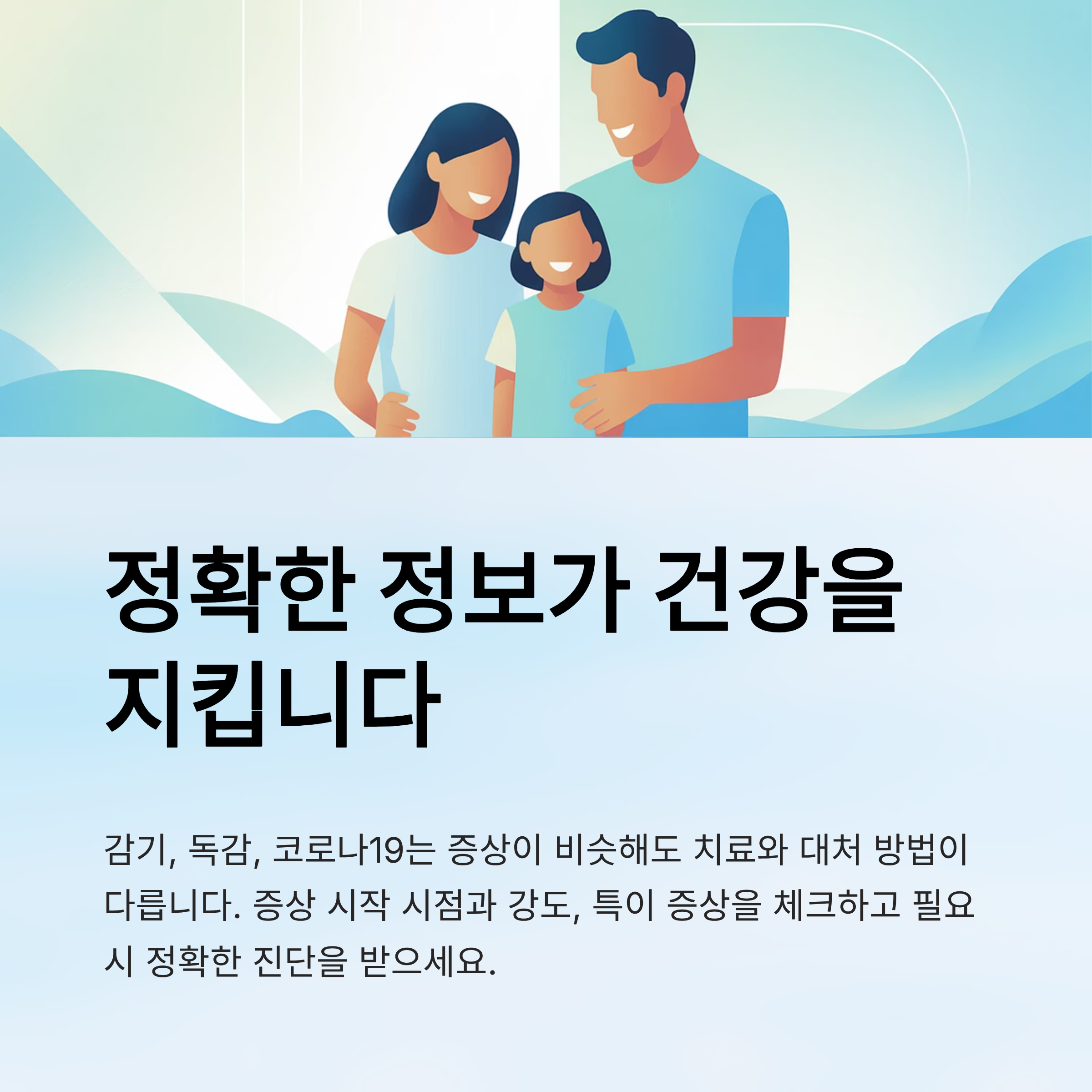 감기, 독감, 코로나19는 증상이 비슷해도 치료와 대처 방법이 다릅니다. 증상이 시작된 시점과 강도, 특이 증상을 체크하고 필요 시 병원 진료와 검사를 통해 정확한 진단을 받는 것이 중요합니다.