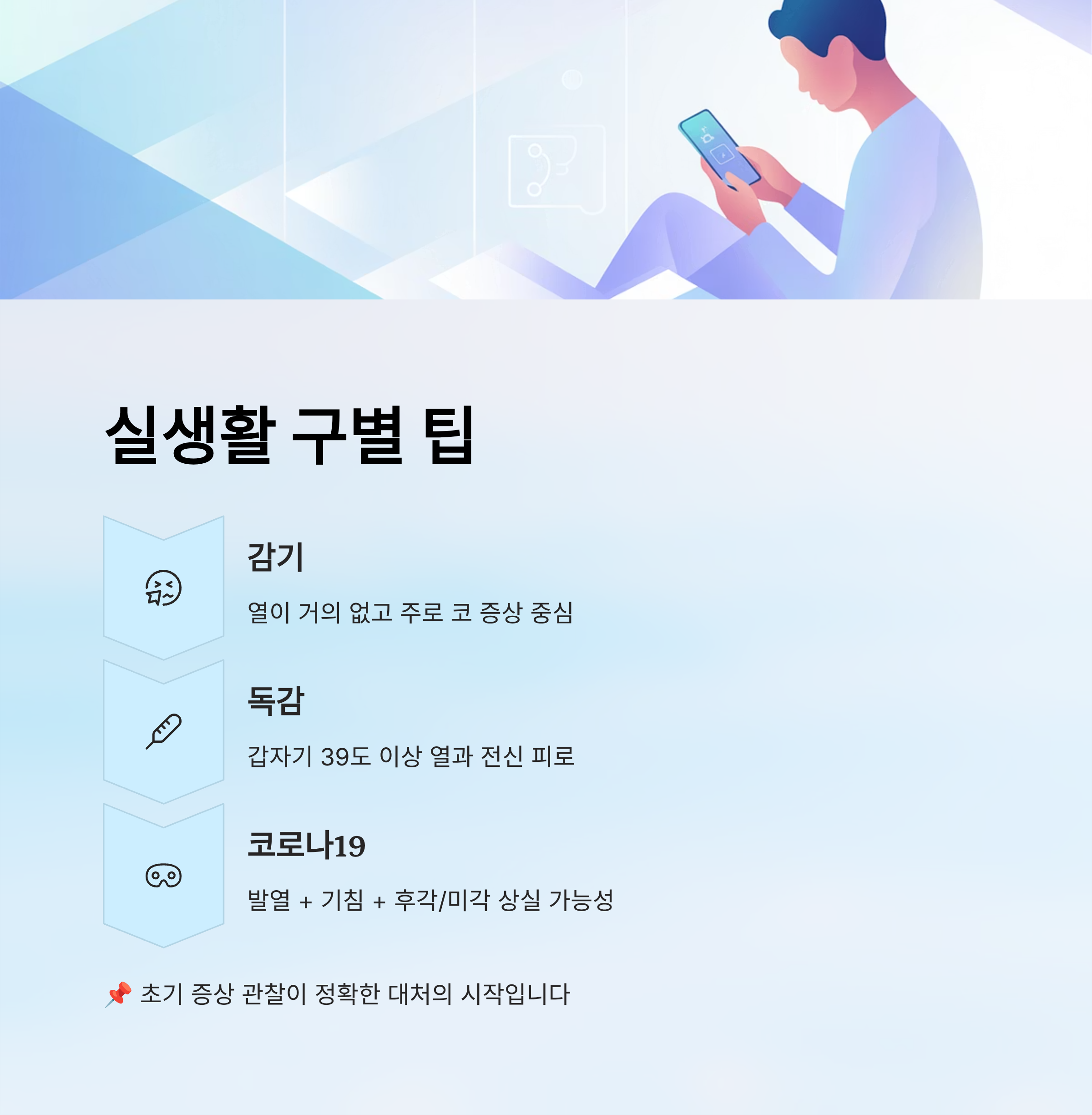 💡 팁: 코로나19는 감기·독감과 유사하지만, 미각/후각 상실, 호흡 곤란이 특징입니다.