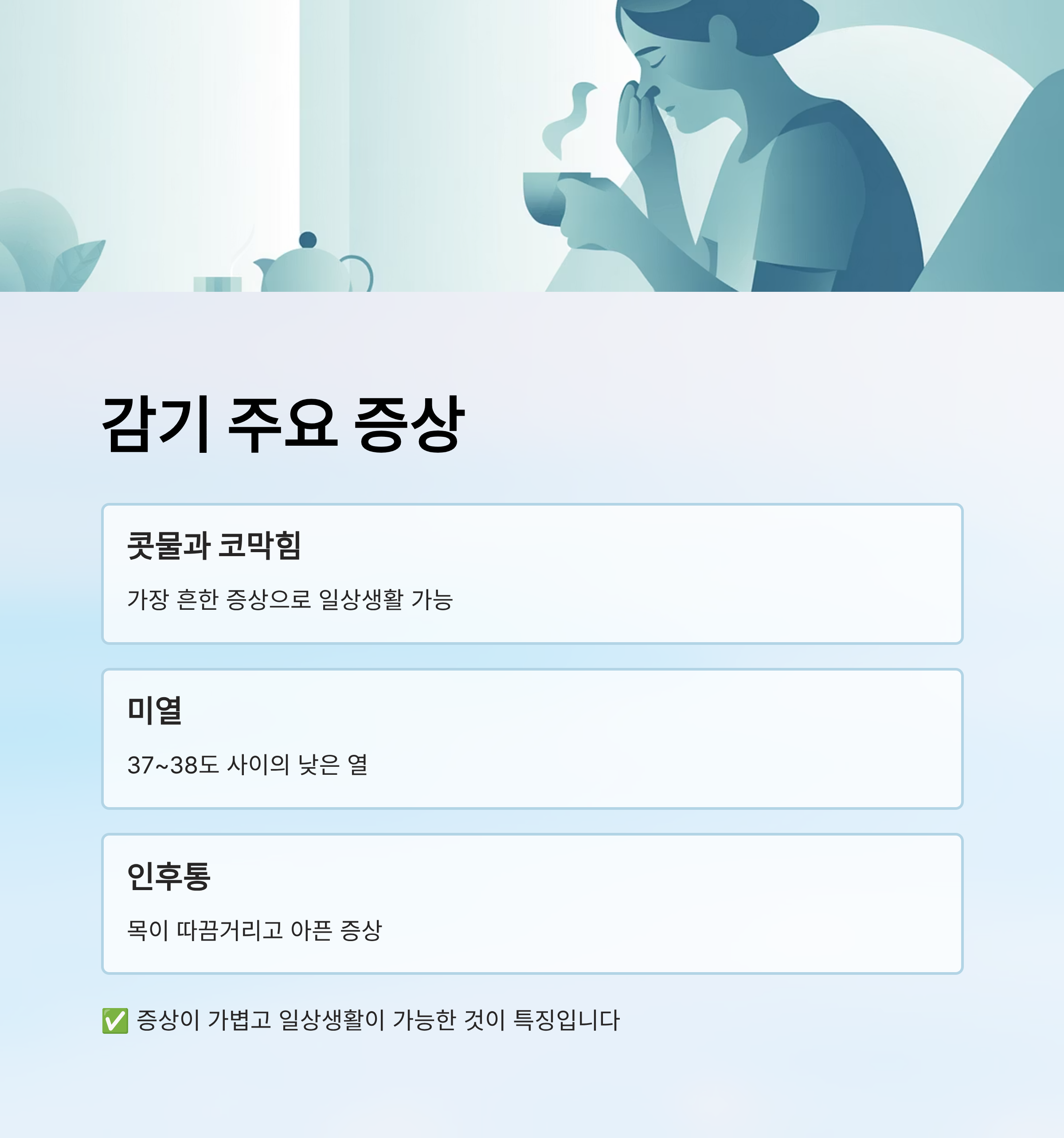 📌 주의: 감기라고 방심하다가 독감이나 코로나로 악화될 수 있으니 초기 증상 관찰이 중요합니다.