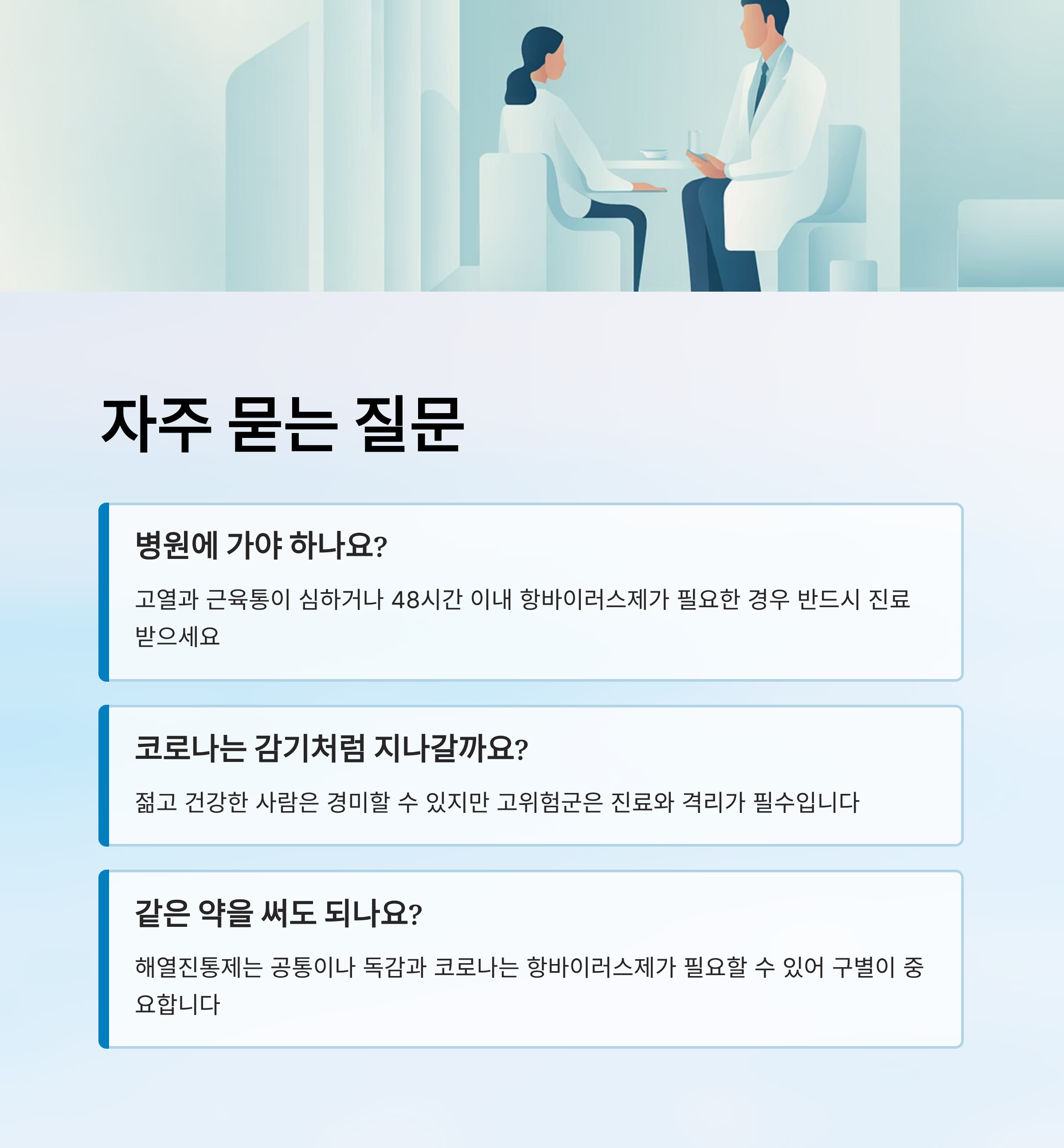 A3. 해열진통제는 공통으로 사용되나, 독감과 코로나는 항바이러스제가 필요할 수 있으므로 구별이 중요합니다.