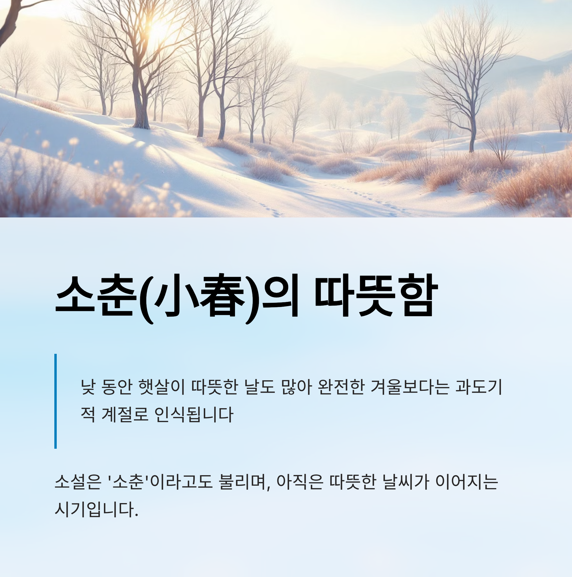 ‘소춘(小春)’이라고도 불리는 이 절기에는 낮 동안 햇살이 따뜻한 날도 많아 완전한 겨울보다는 과도기적 계절로 인식됩니다.