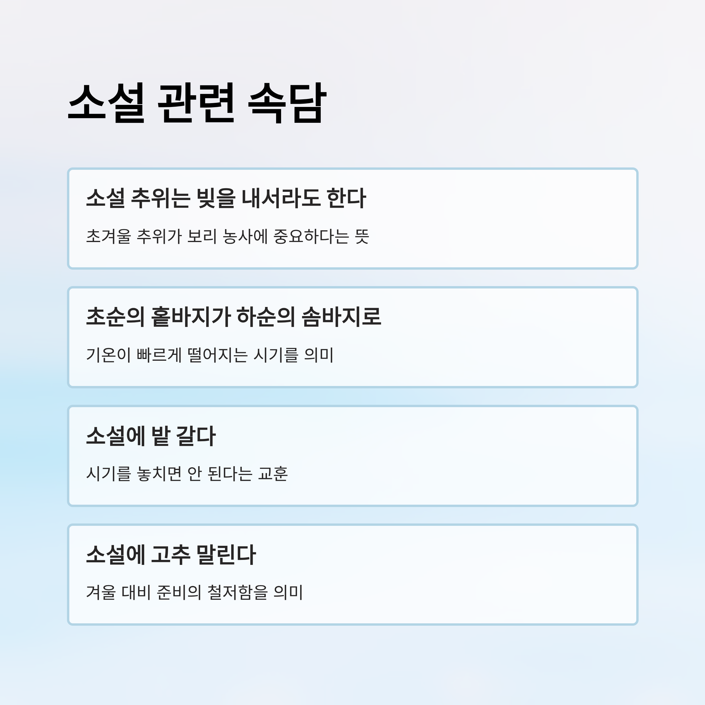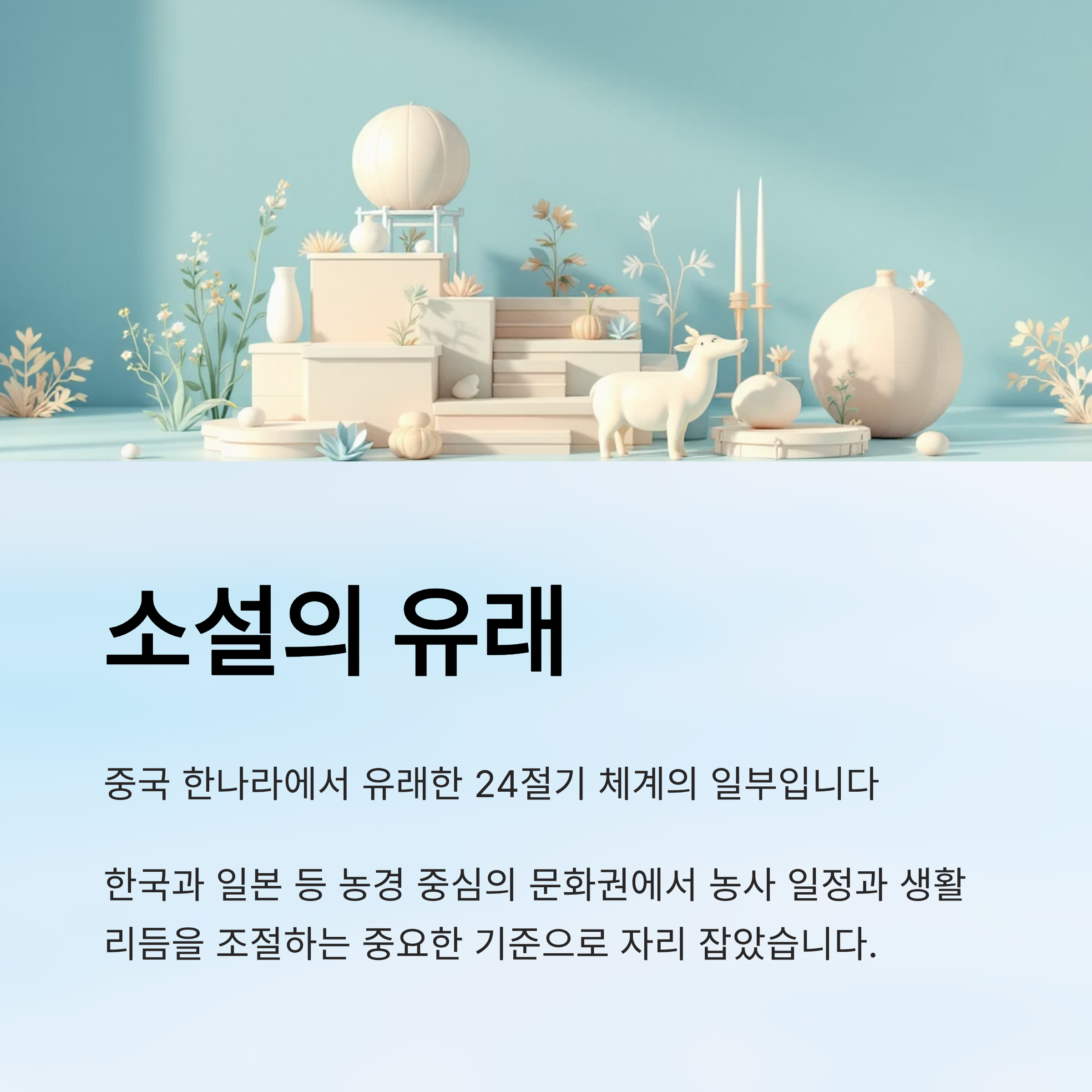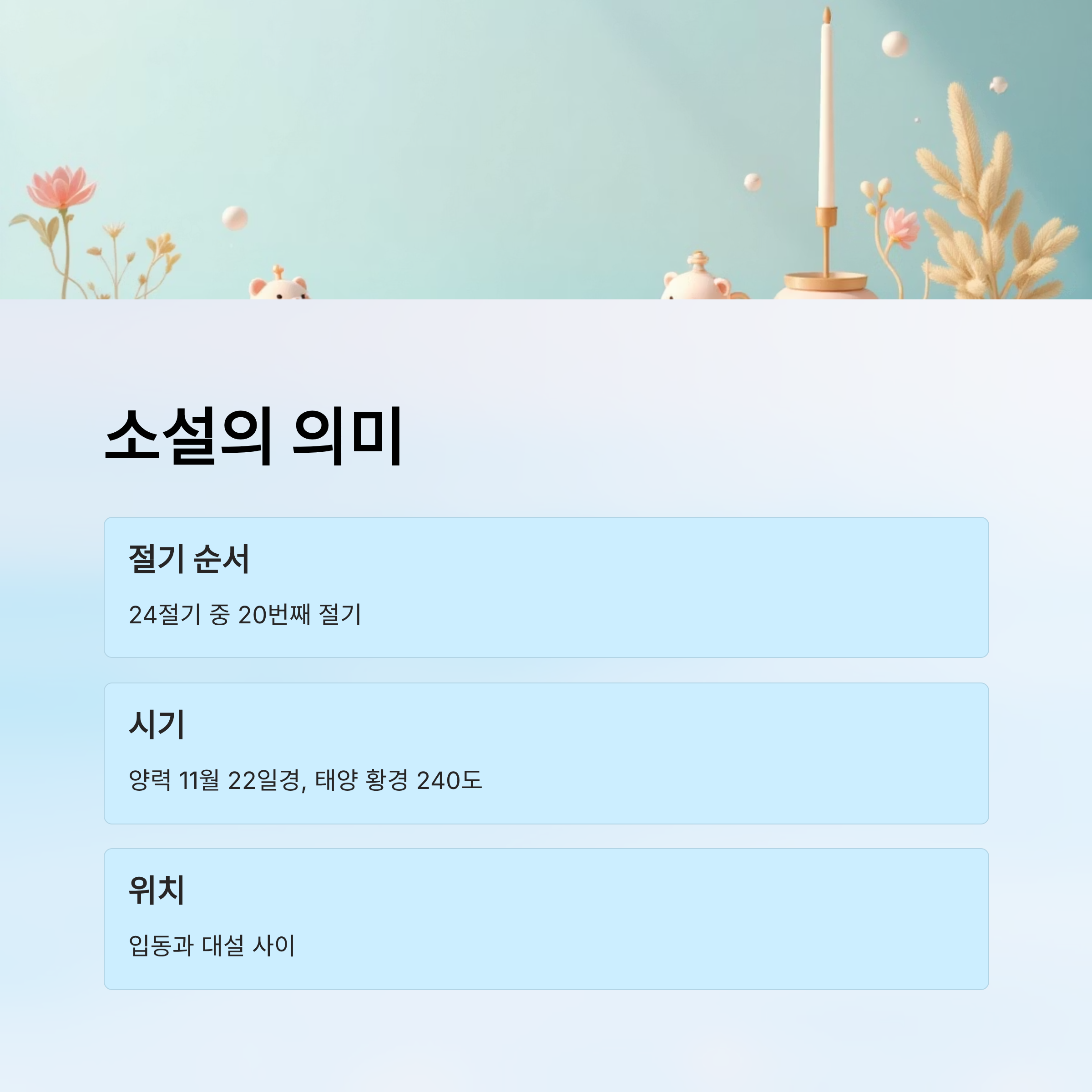 소설은 중국 한나라에서 유래한 24절기 체계의 일부로, 한국과 일본 등 농경 중심의 문화권에서 농사 일정과 생활 리듬을 조절하는 중요한 기준으로 자리 잡았습니다.