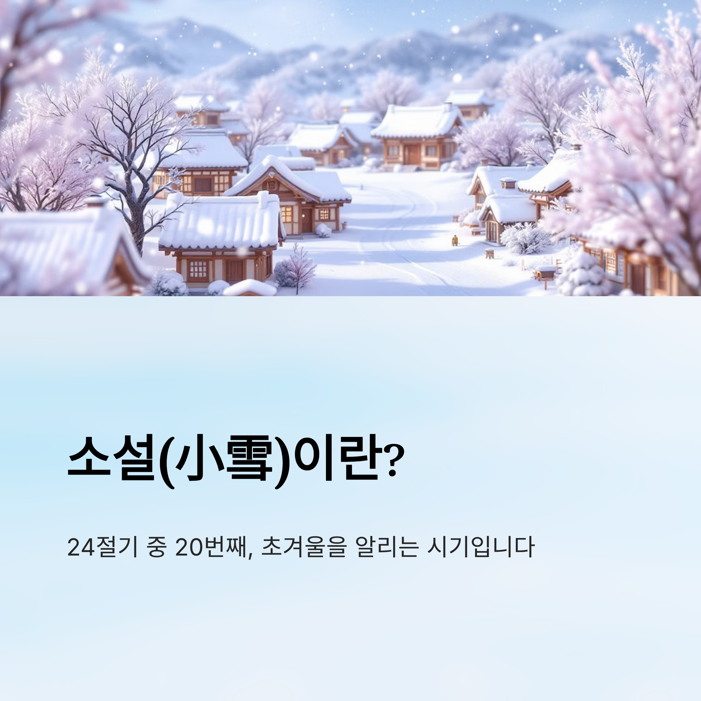‘소설(小雪)’은 24절기 중 20번째 절기로, 양력 11월 22일경, 태양의 황경이 240도에 도달할 때를 의미합니다. 이름 그대로 ‘작은 눈’이라는 뜻을 지니며, 입동과 대설 사이에 위치해 본격적인 겨울로 접어드는 시기입니다.