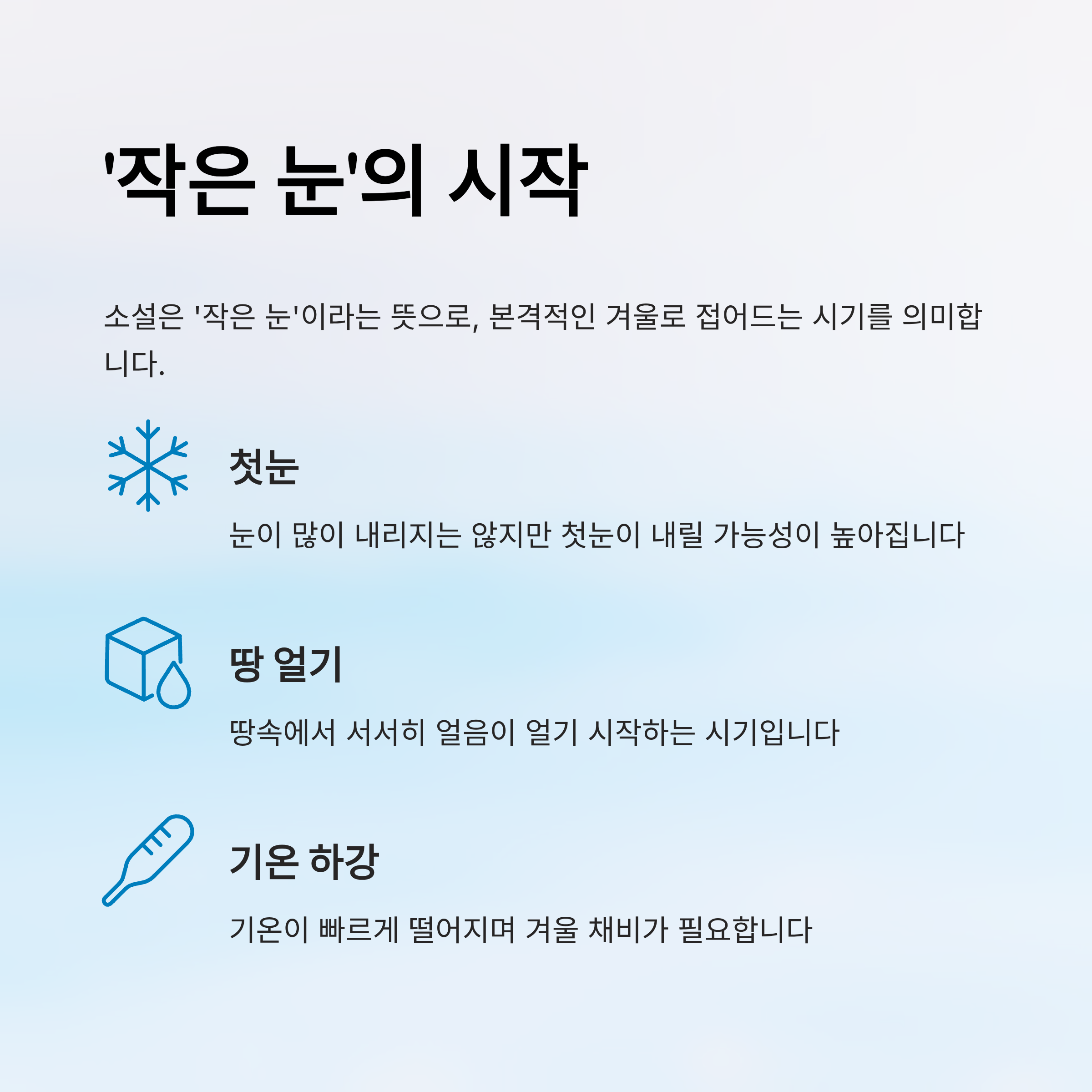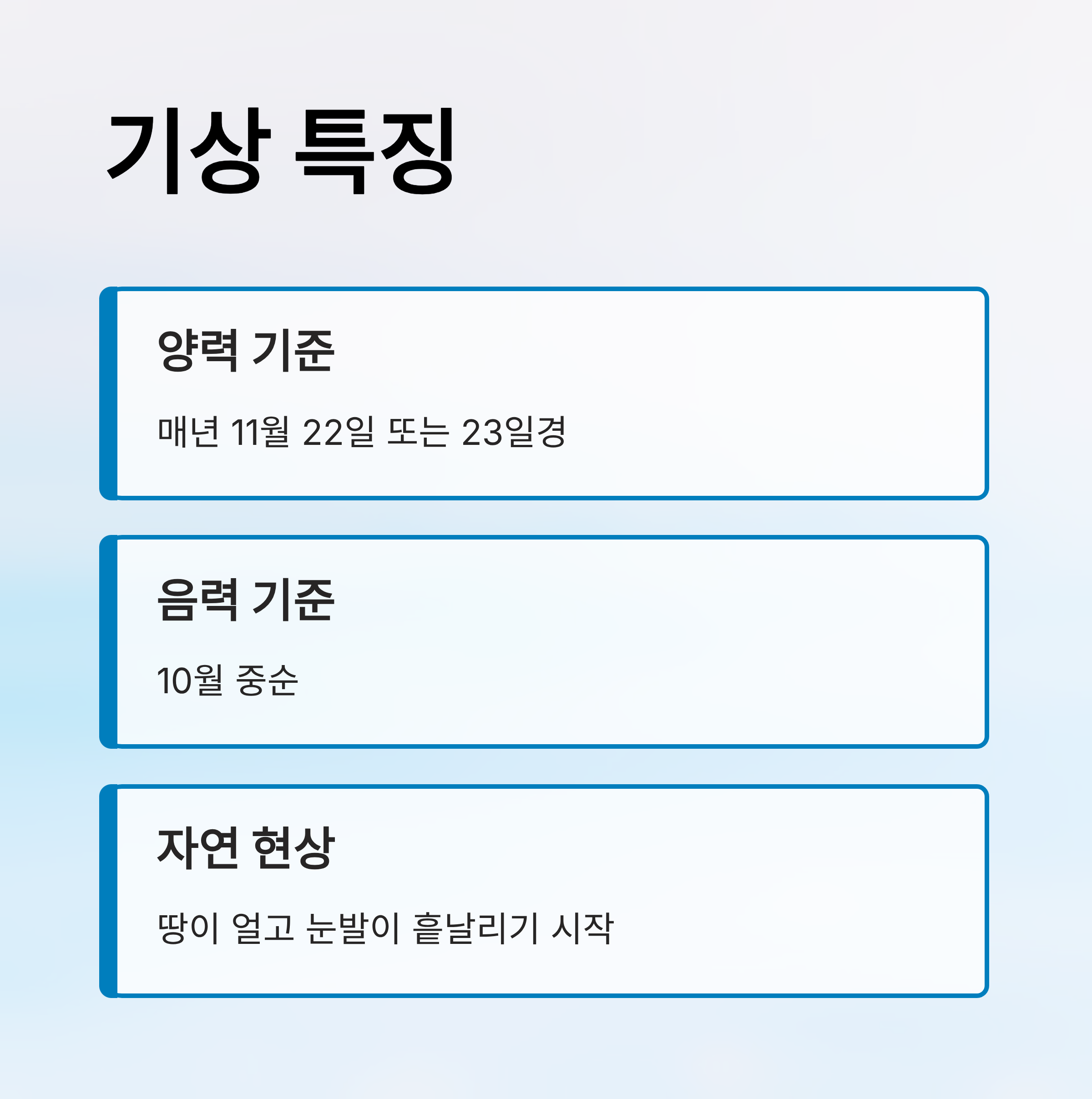 - 기상 특징: 땅이 얼고 눈발이 흩날리기 시작