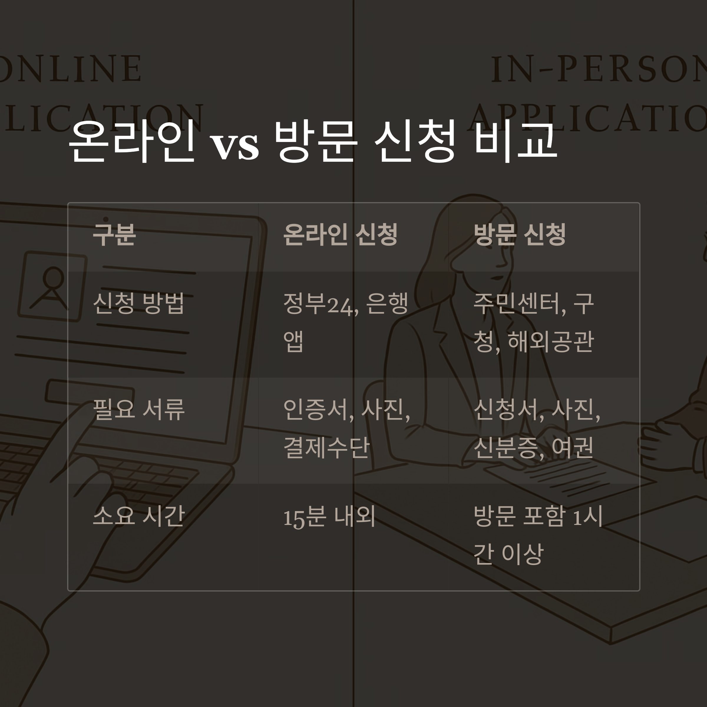 | 신청 방법 | 정부24, 은행 앱 | 주민센터, 구청 민원실, 해외 공관 |