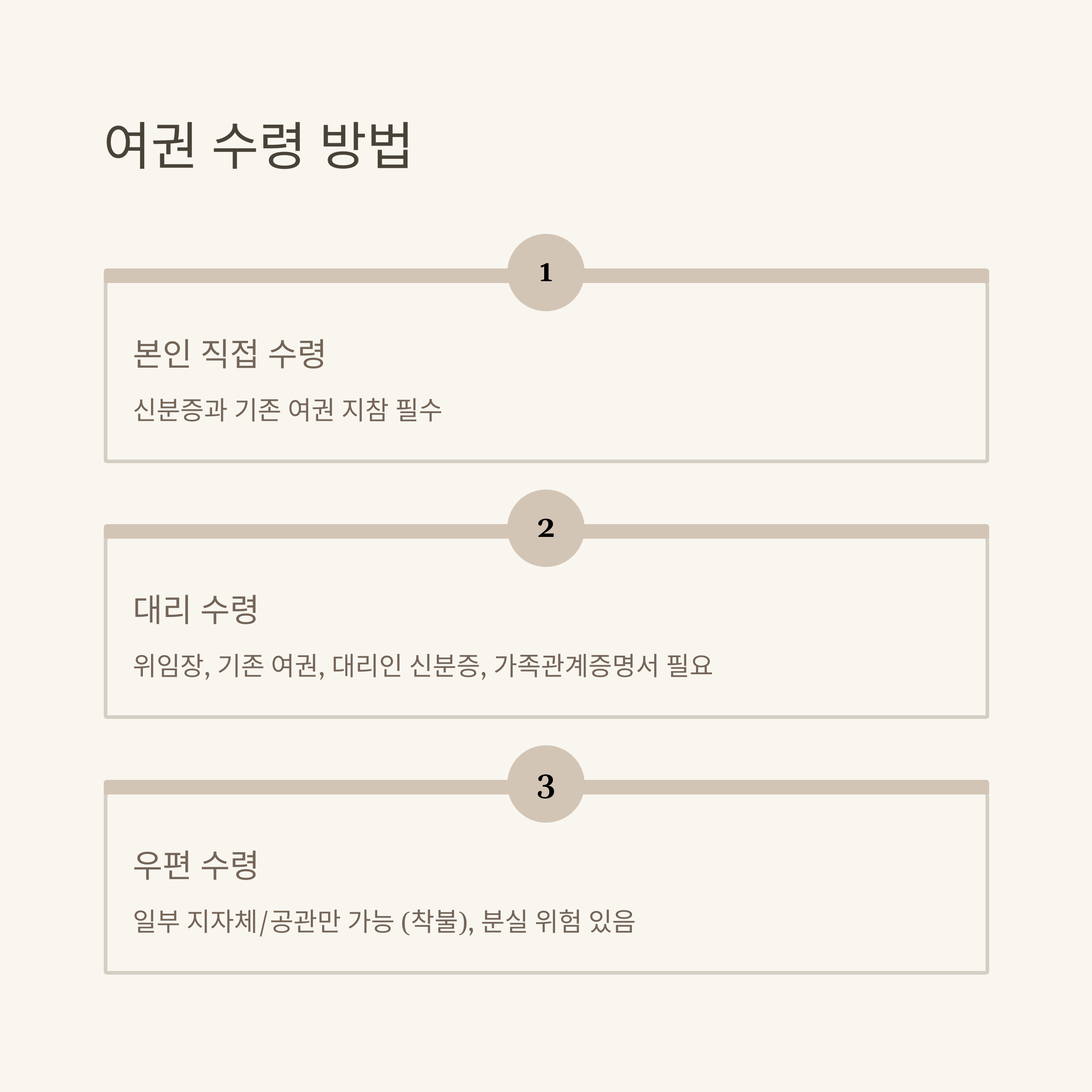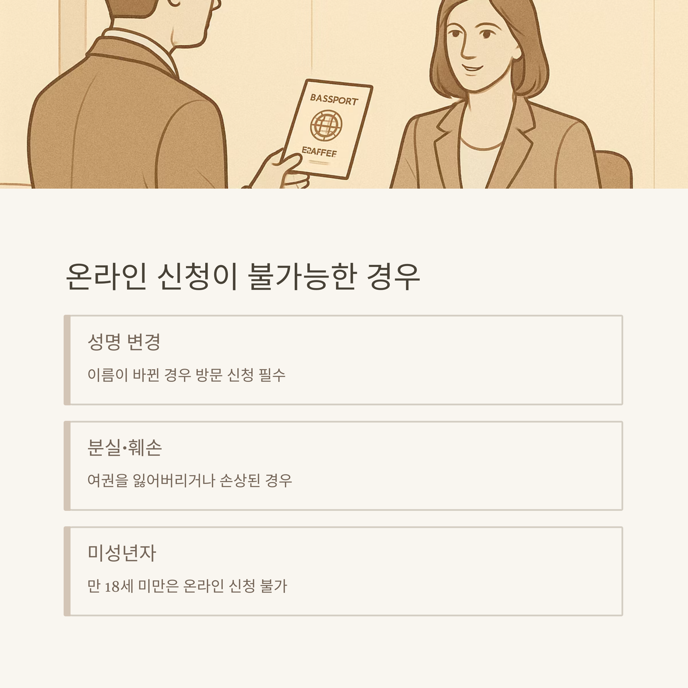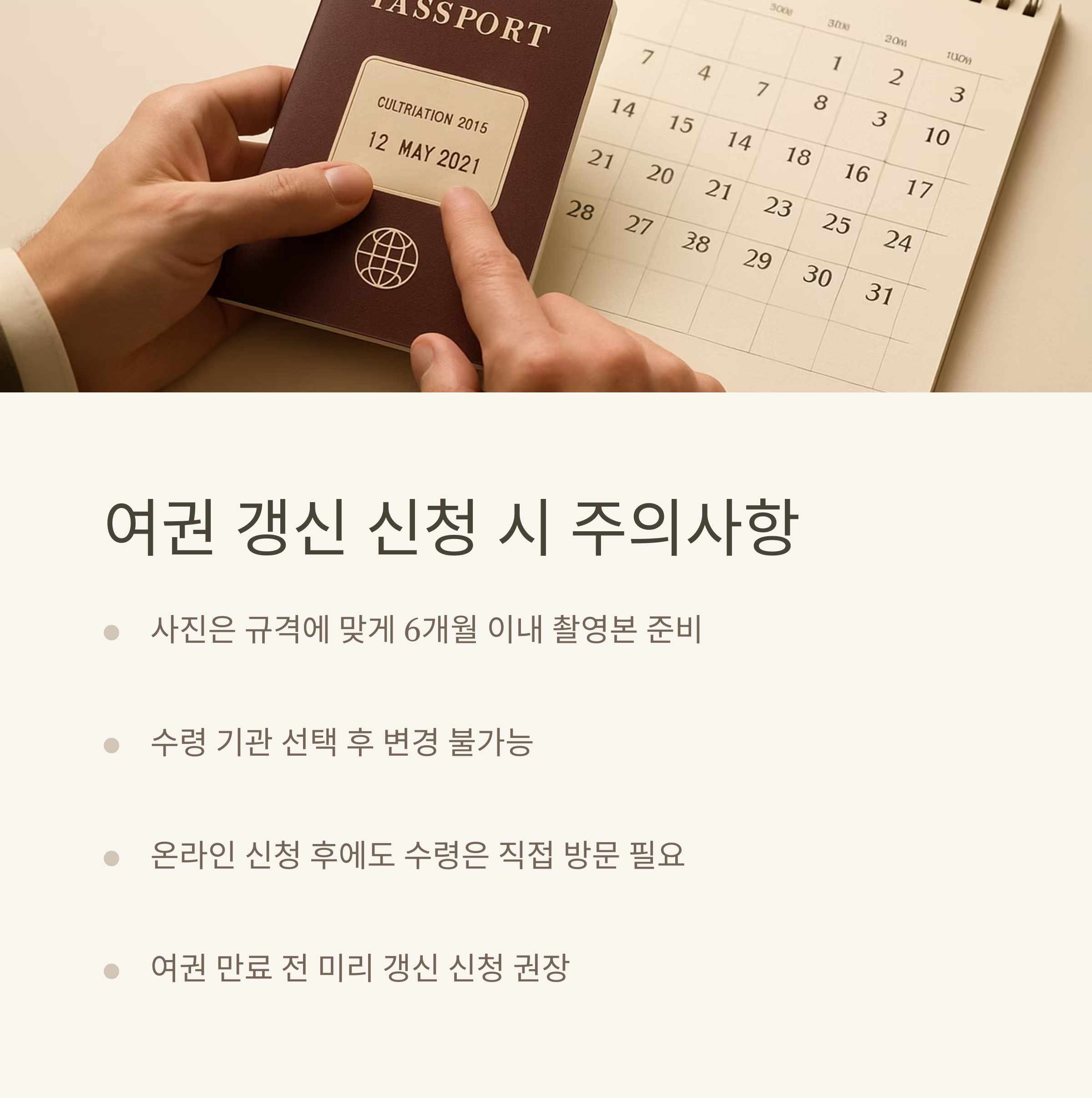 - 본인 직접 수령 원칙 (신분증+기존 여권 지참)