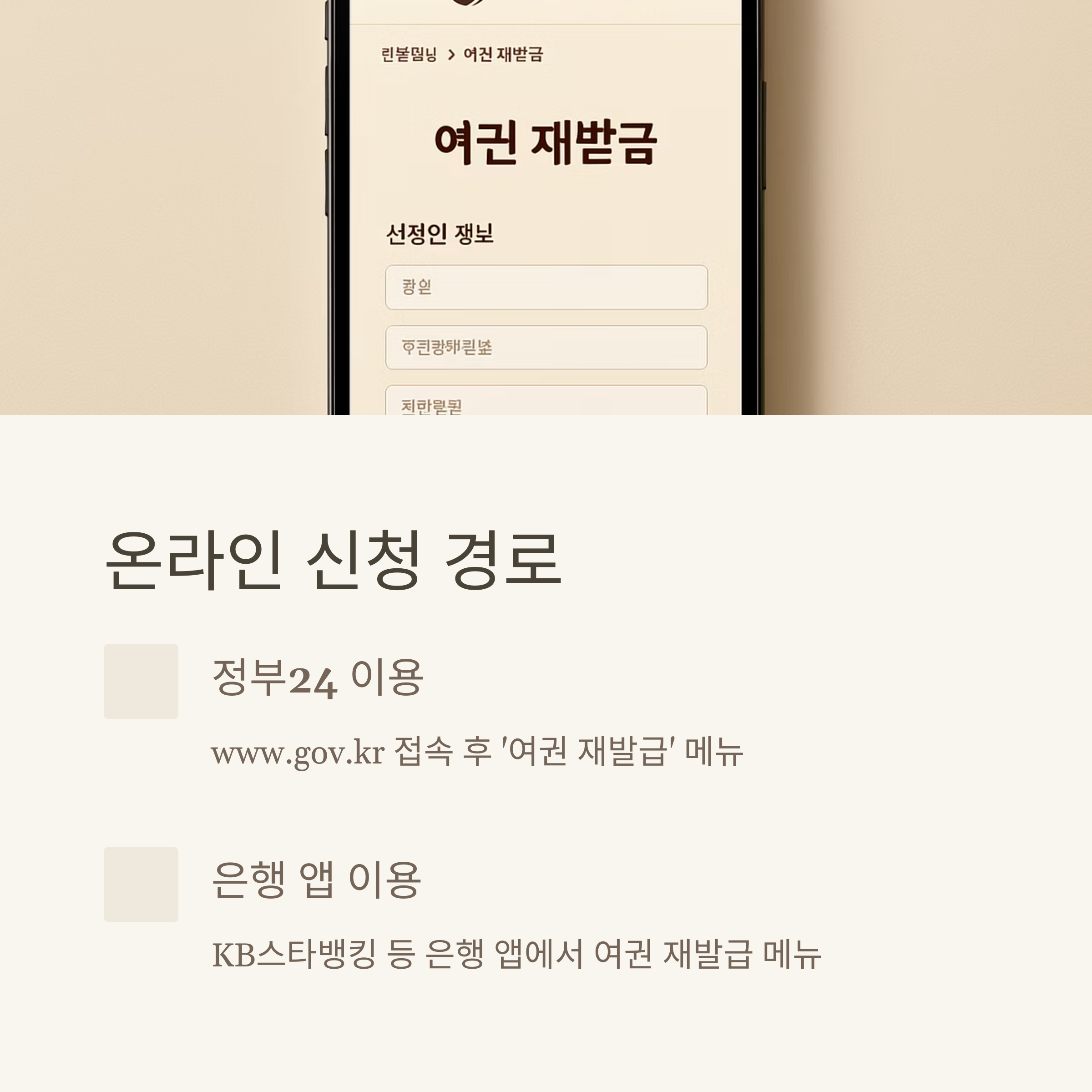 - 은행 앱(예: KB스타뱅킹 등) → 여권 재발급 메뉴 이용