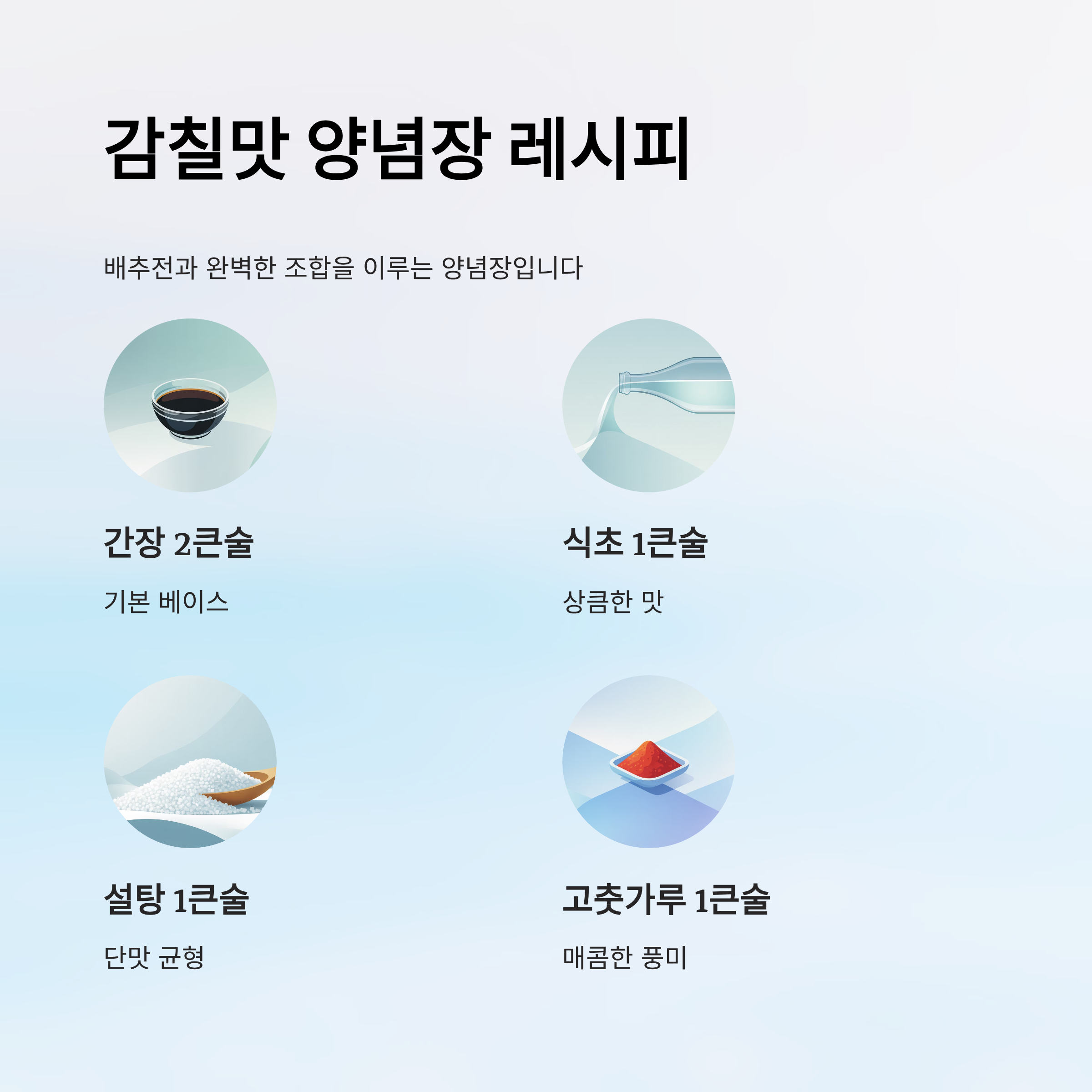 - 기본 재료: 간장 2큰술, 식초 1큰술, 설탕 1큰술, 고춧가루 1큰술, 다진 청양고추