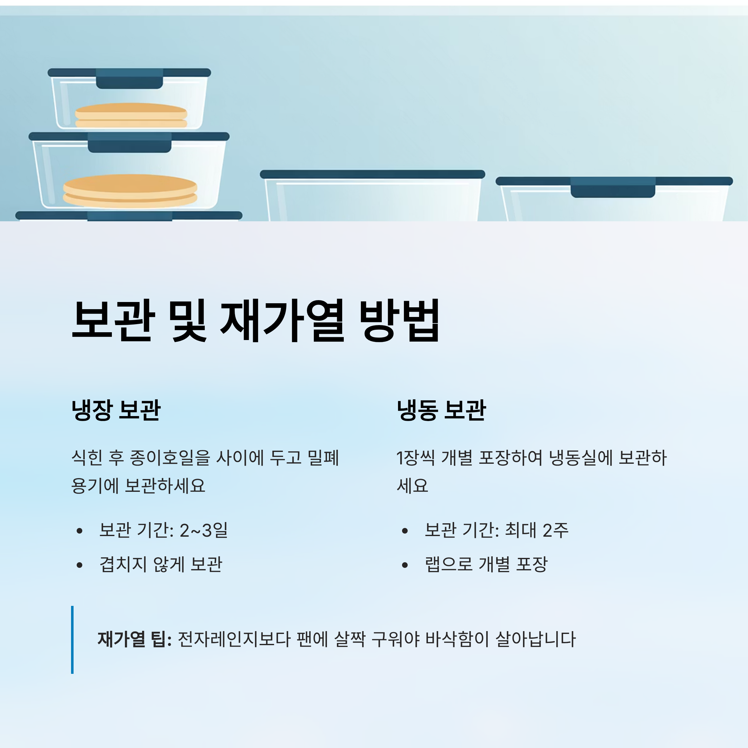 - 냉동 보관은 1장씩 포장하여 최대 2주 가능