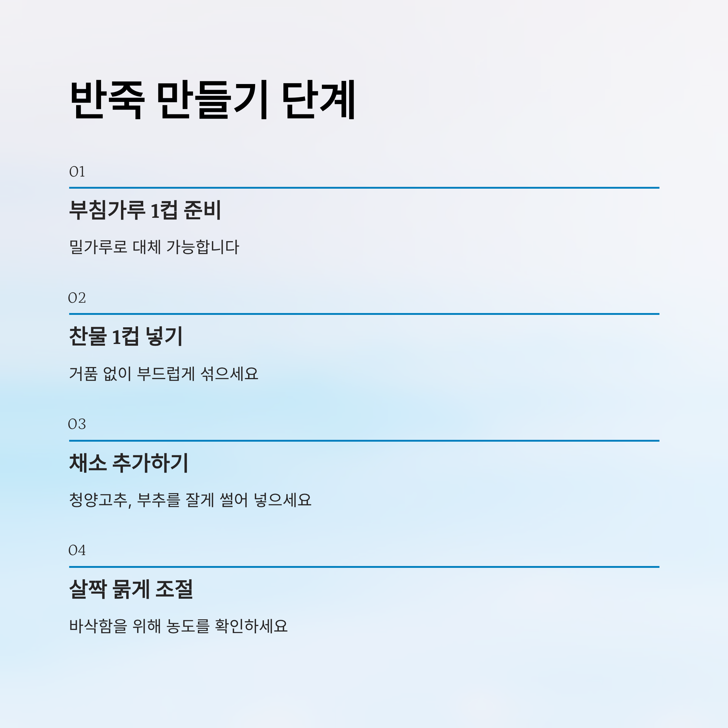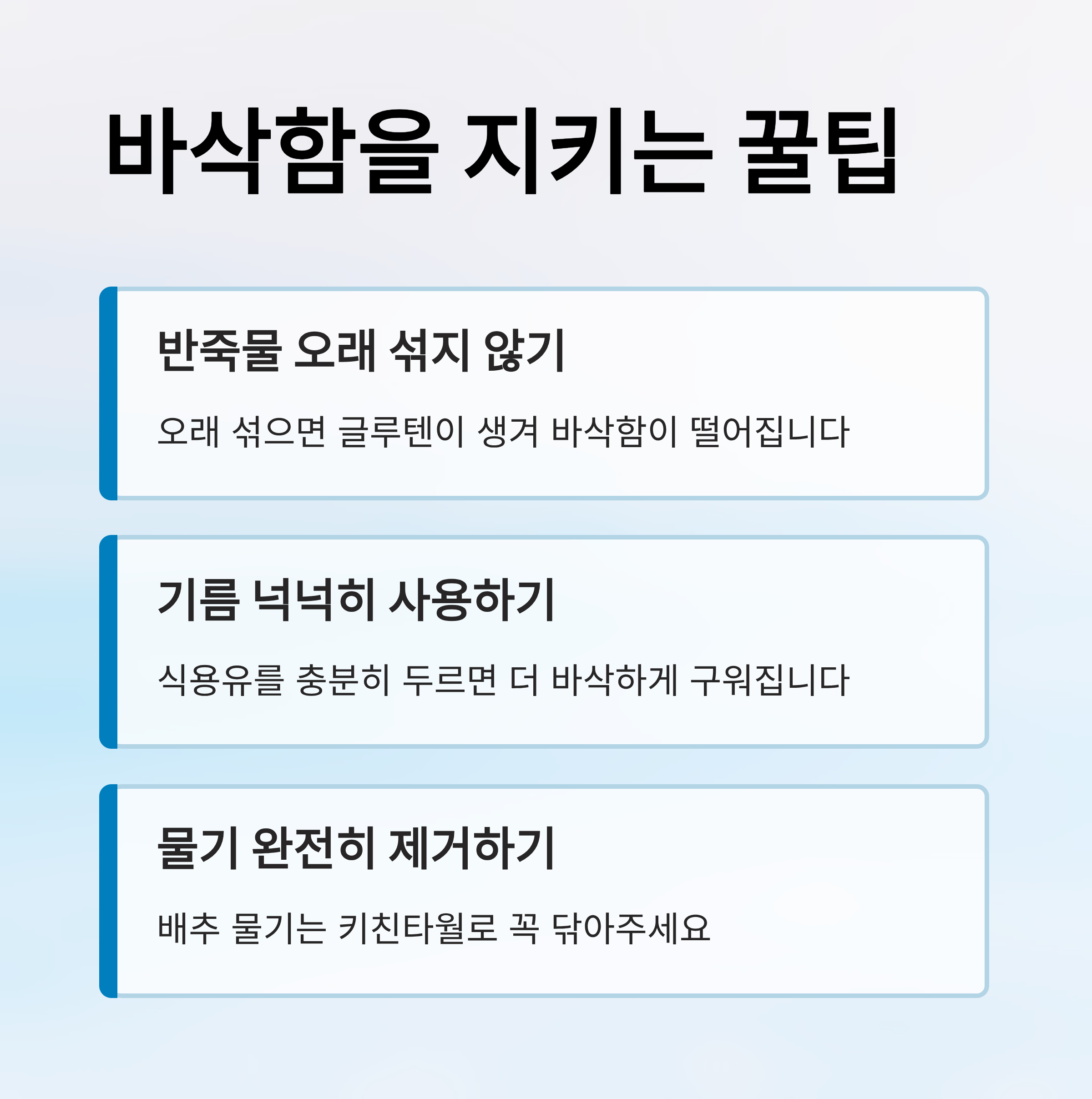 - 거품 없이 부드럽게 섞되, 살짝 묽게 만드는 것이 바삭함의 비결입니다.