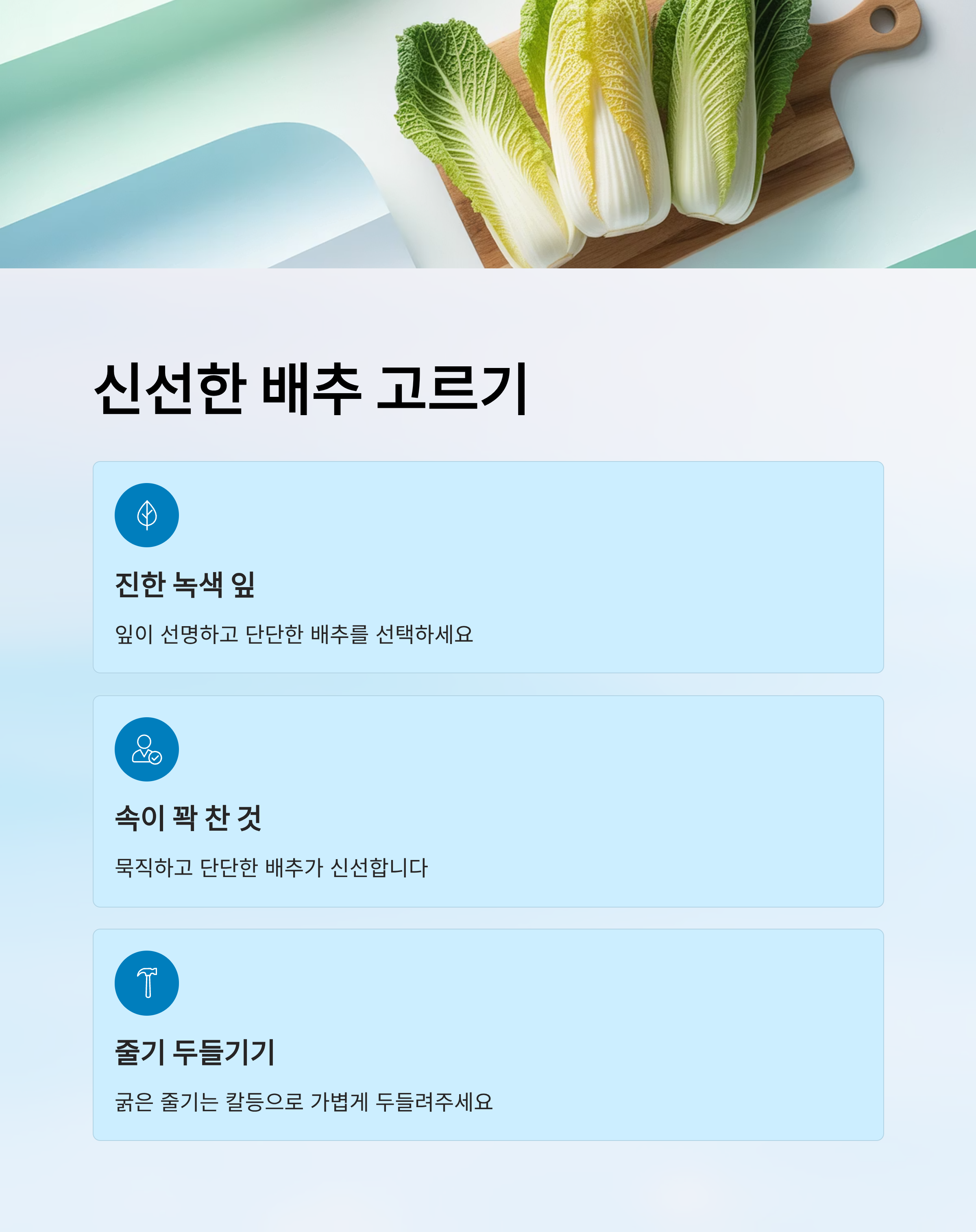 - 잎이 진한 녹색이고 단단하며 속이 꽉 찬 배추를 고르세요.
