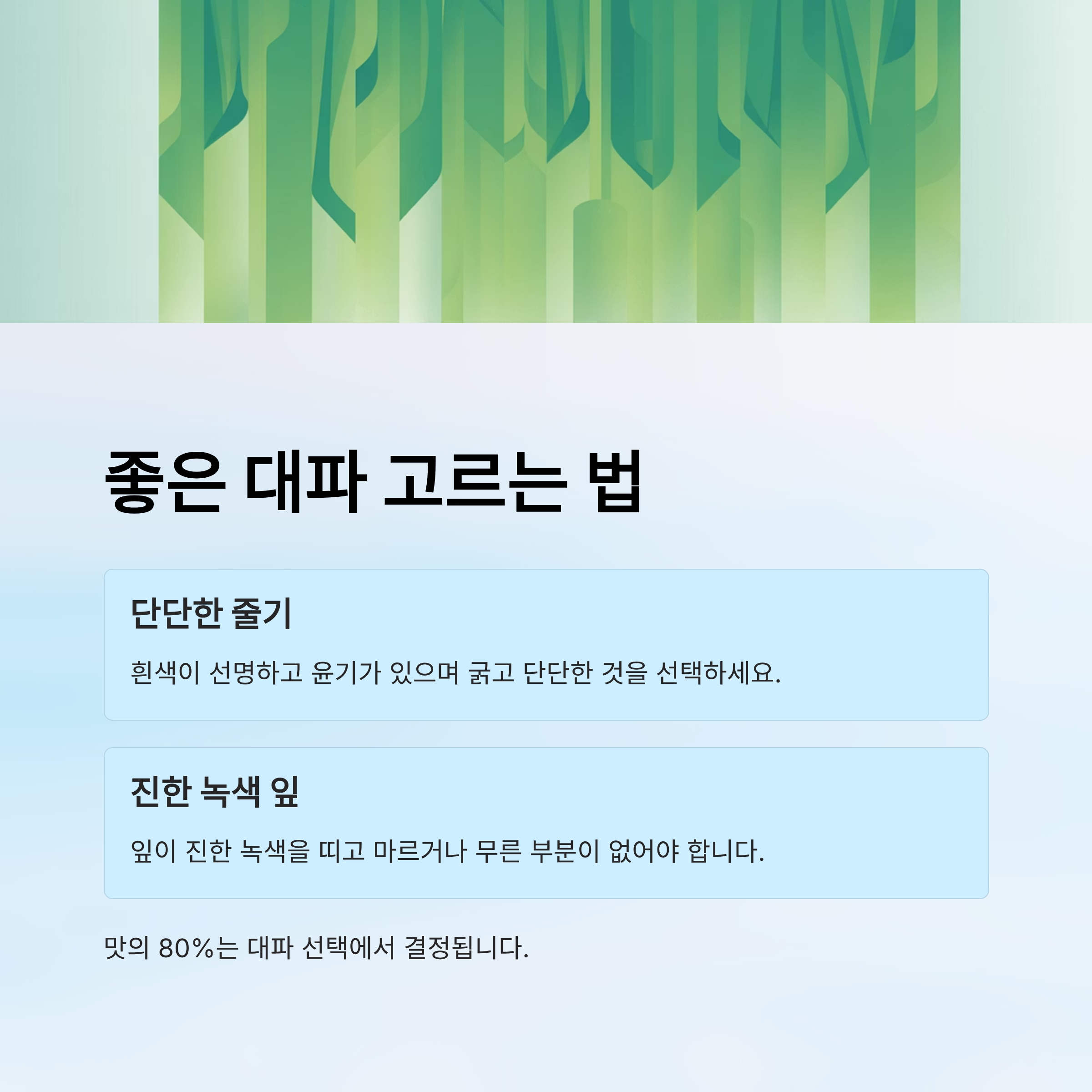 대파김치에 사용될 대파는 단단하고 잎이 진한 녹색을 띠는 것이 좋습니다. 줄기 부분은 흰색이 선명하고 윤기가 있으며, 너무 마르거나 무른 부분이 없어야 합니다. 김치에 사용할 대파는 특히 굵고 단단한 것을 선택해야 양념이 잘 배고 아삭한 식감을 유지할 수 있습니다.