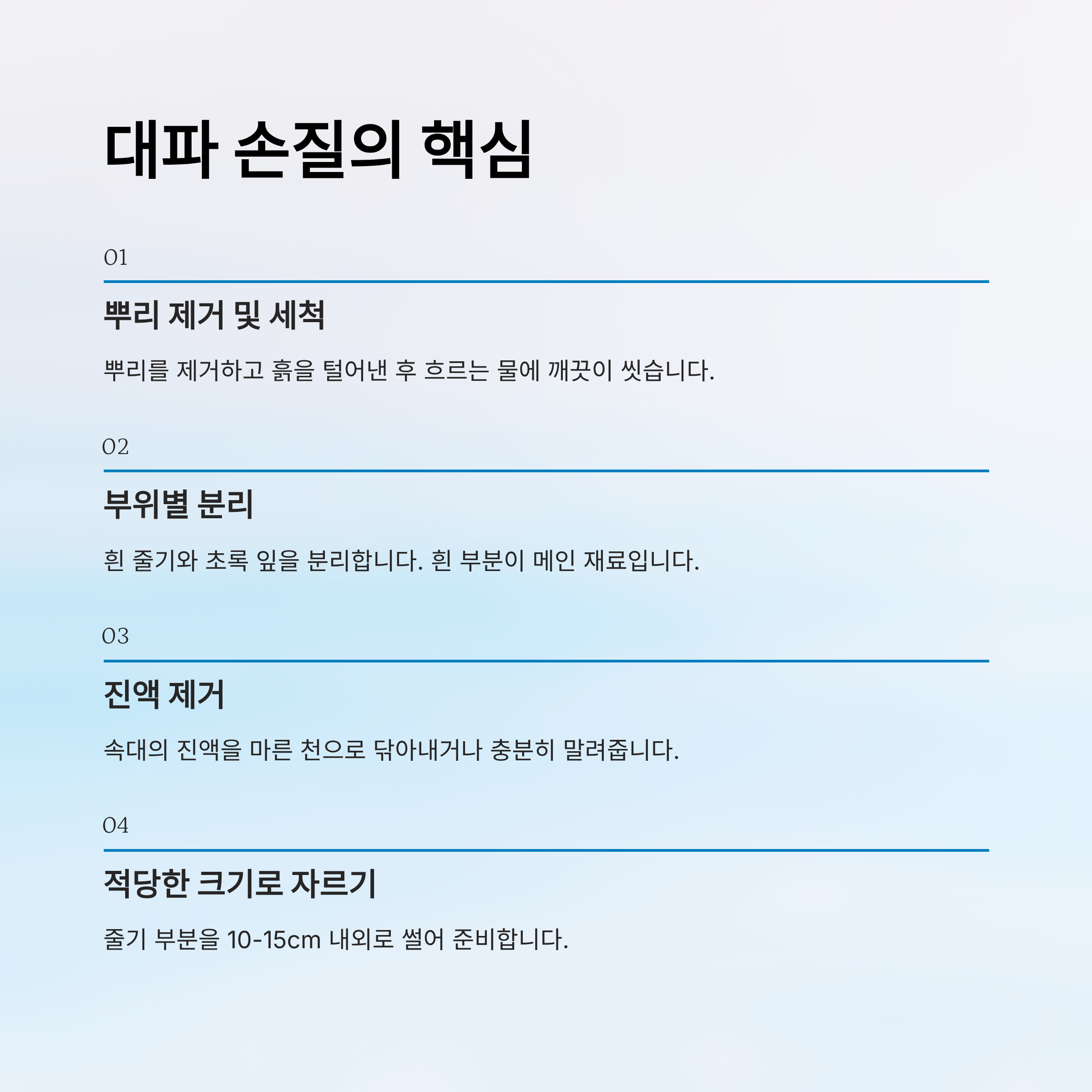 - 대파는 흰 줄기 부분과 초록 잎 부분을 분리하여 손질합니다. 흰 부분은 김치의 메인 재료로 활용되고, 초록 잎은 기호에 따라 같이 담가도 좋습니다.