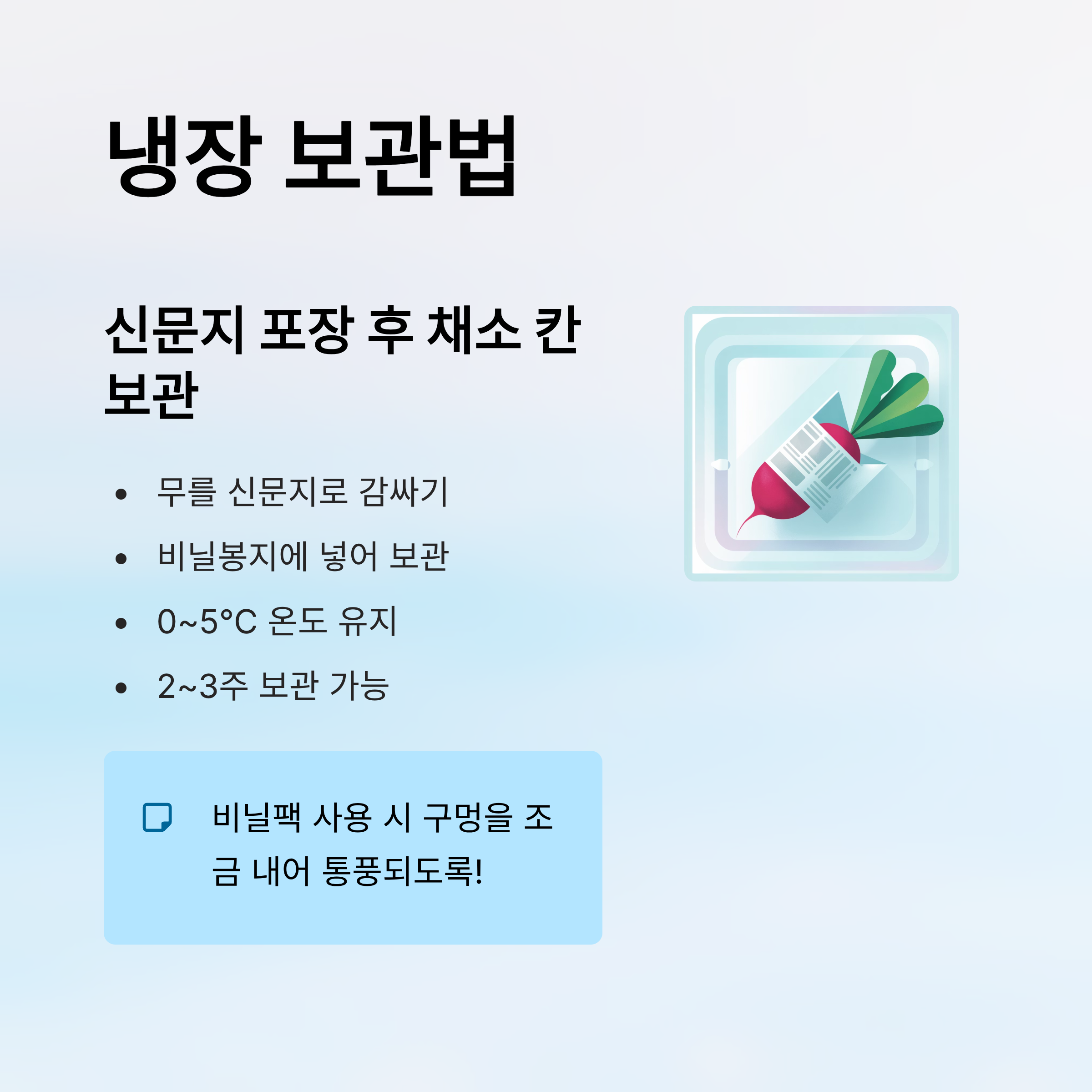 | 냉장 보관 | 무를 신문지로 감싸고, 비닐봉지에 넣어 채소 칸에 보관 | 0~5℃ 유지, 2~3주 보관 가능 |