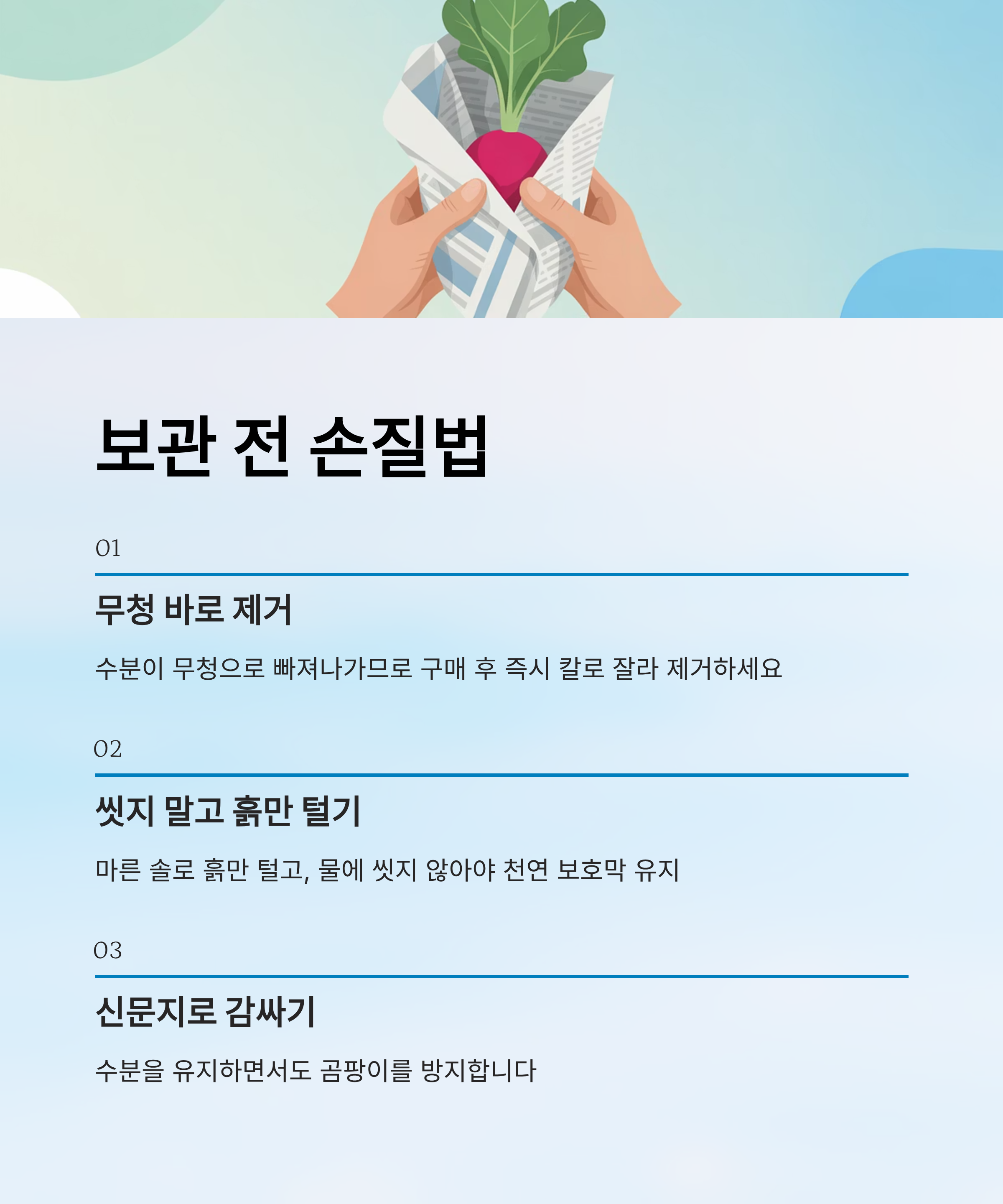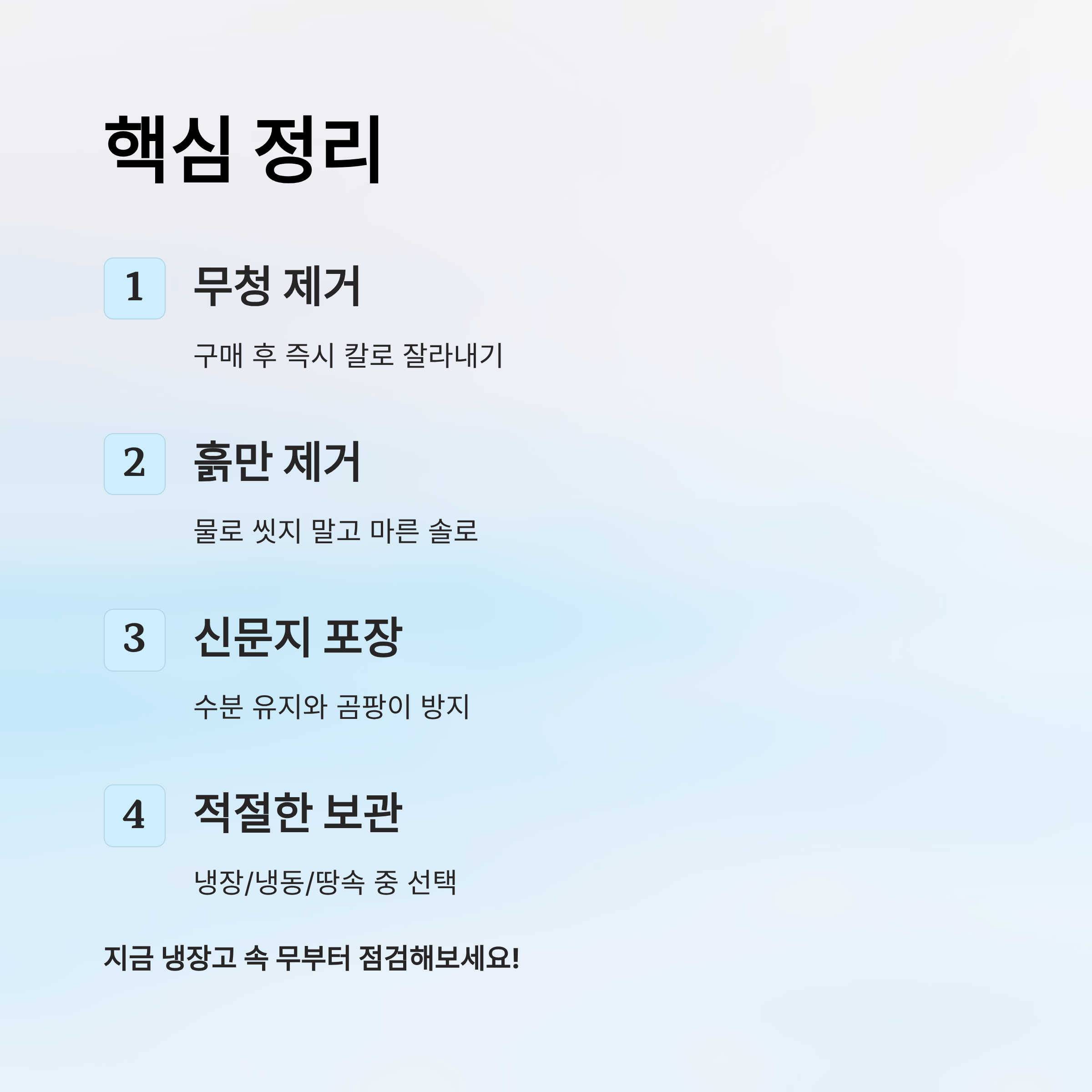 - 무청 제거 → 흙 제거 → 신문지 포장 → 냉장/냉동/지하실 보관