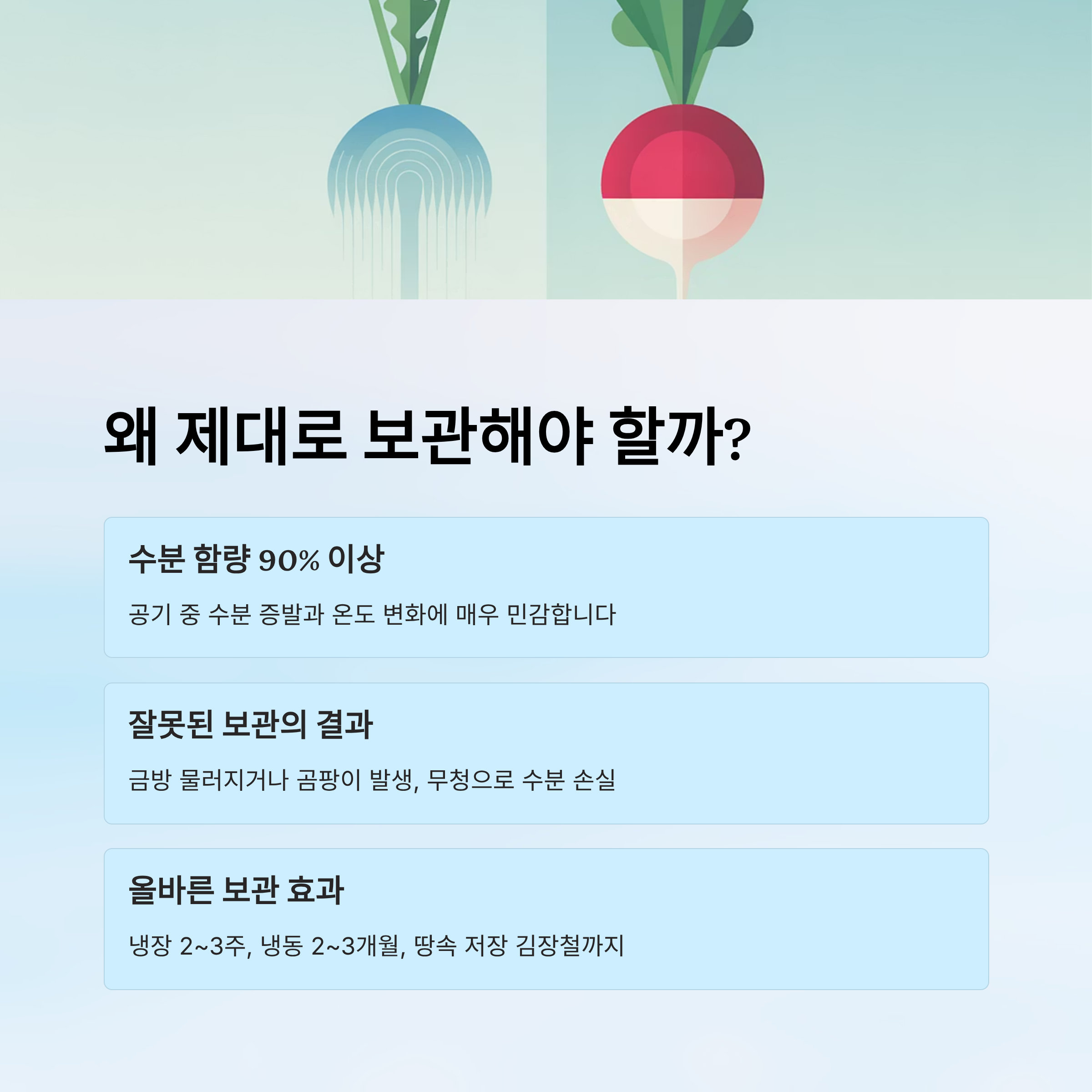 무는 수분 함량이 90% 이상으로, 공기 중 수분 증발과 온도 변화에 매우 민감합니다. 잘못 보관하면 금방 물러지거나 곰팡이가 생기고, 무청이 붙은 채로 두면 수분이 빠져나가 금방 시들어버리기도 합니다.