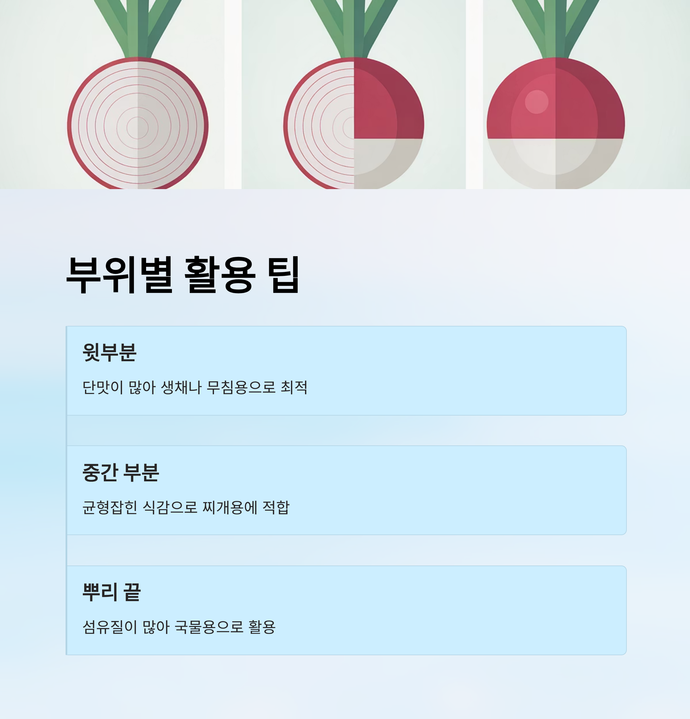 - 뿌리 끝: 섬유질 많아 국물용