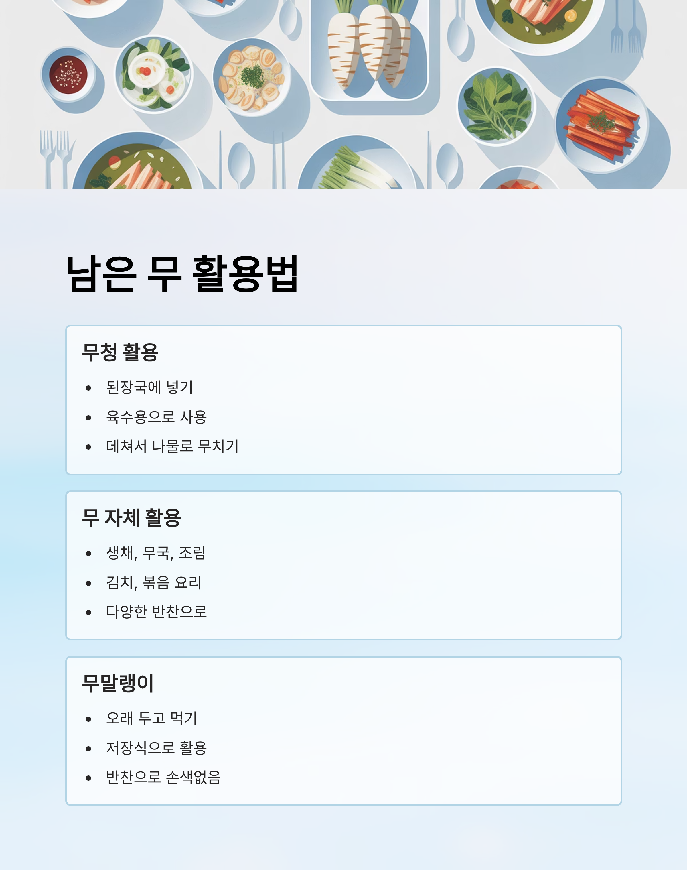 - 무 자체: 생채, 무국, 조림, 김치, 볶음 등 다양하게 사용