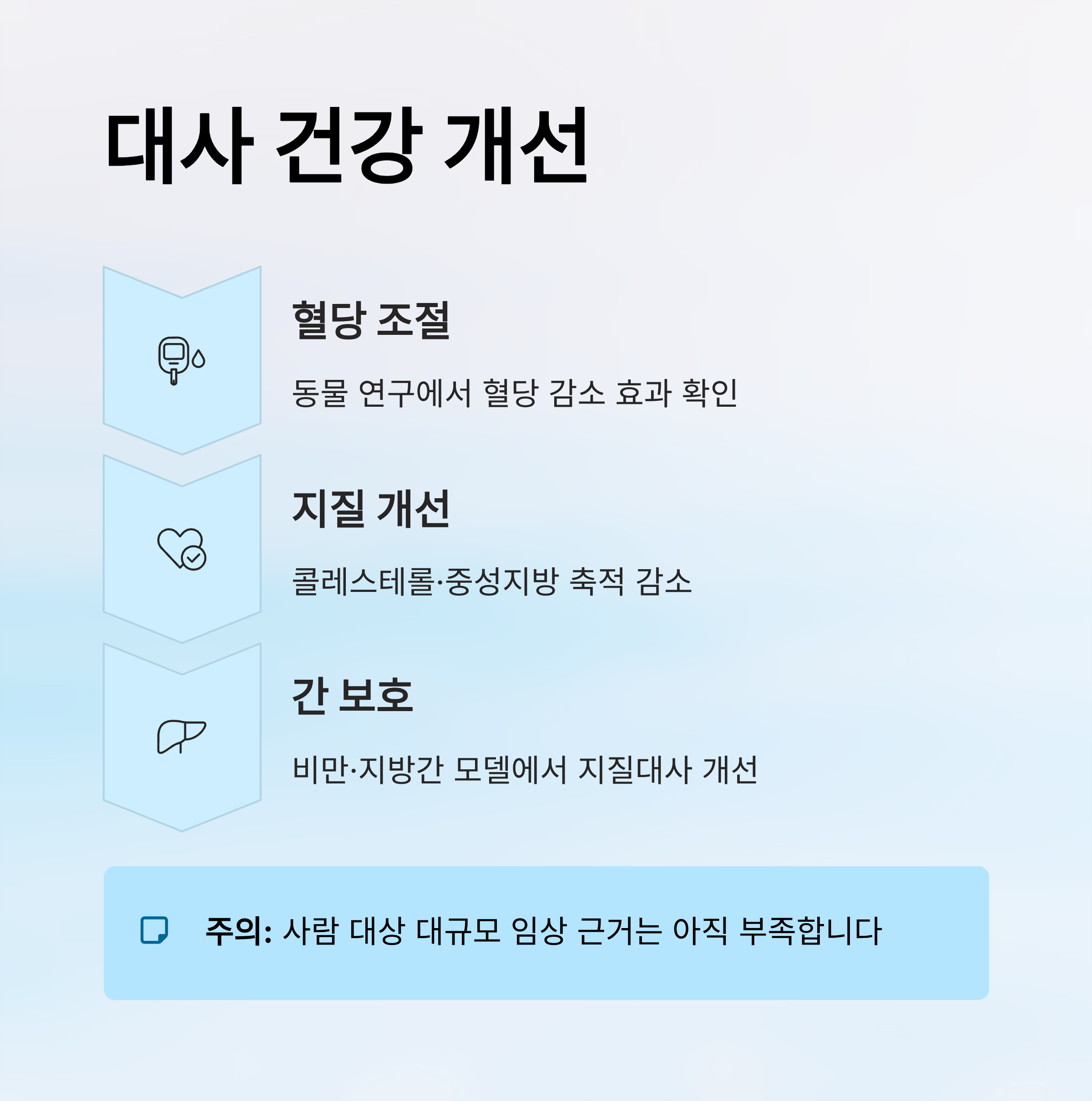 - 비만·지방간 모델에서 지질대사 개선과 간 보호 작용이 보고되지만, 사람 대상 대규모 임상 근거는 아직 부족합니다.