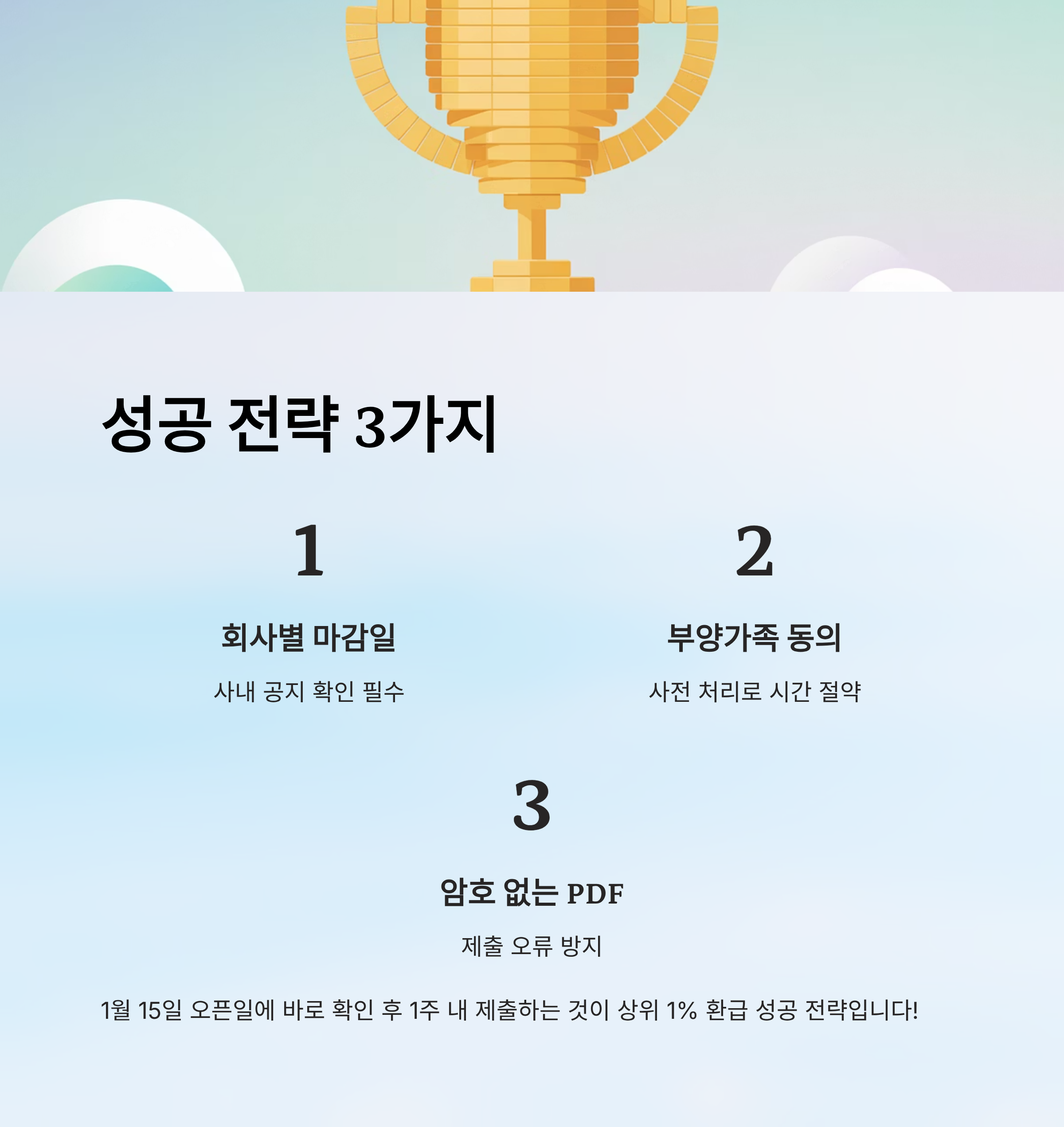 연말정산은 ‘제출 타이밍’과 ‘자료 정확성’이 가장 중요합니다. 1월 15일 홈택스 오픈일에 바로 자료 확인 후 1주 내 제출하는 것이 상위 1% 환급 성공 전략입니다.