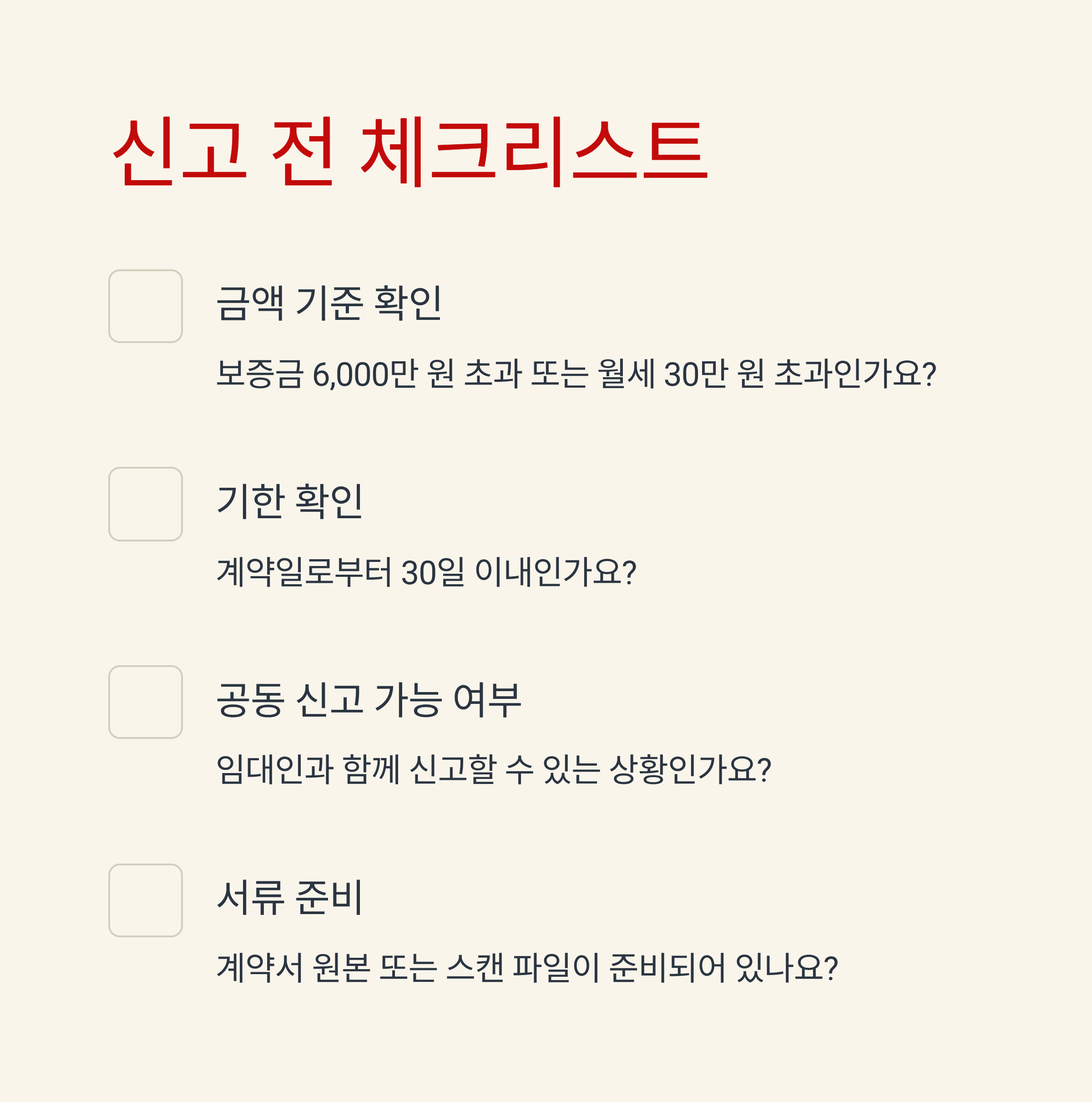 이 4가지 조건만 점검하면, 전세계약 신고는 생각보다 간단하게 마무리할 수 있습니다.
