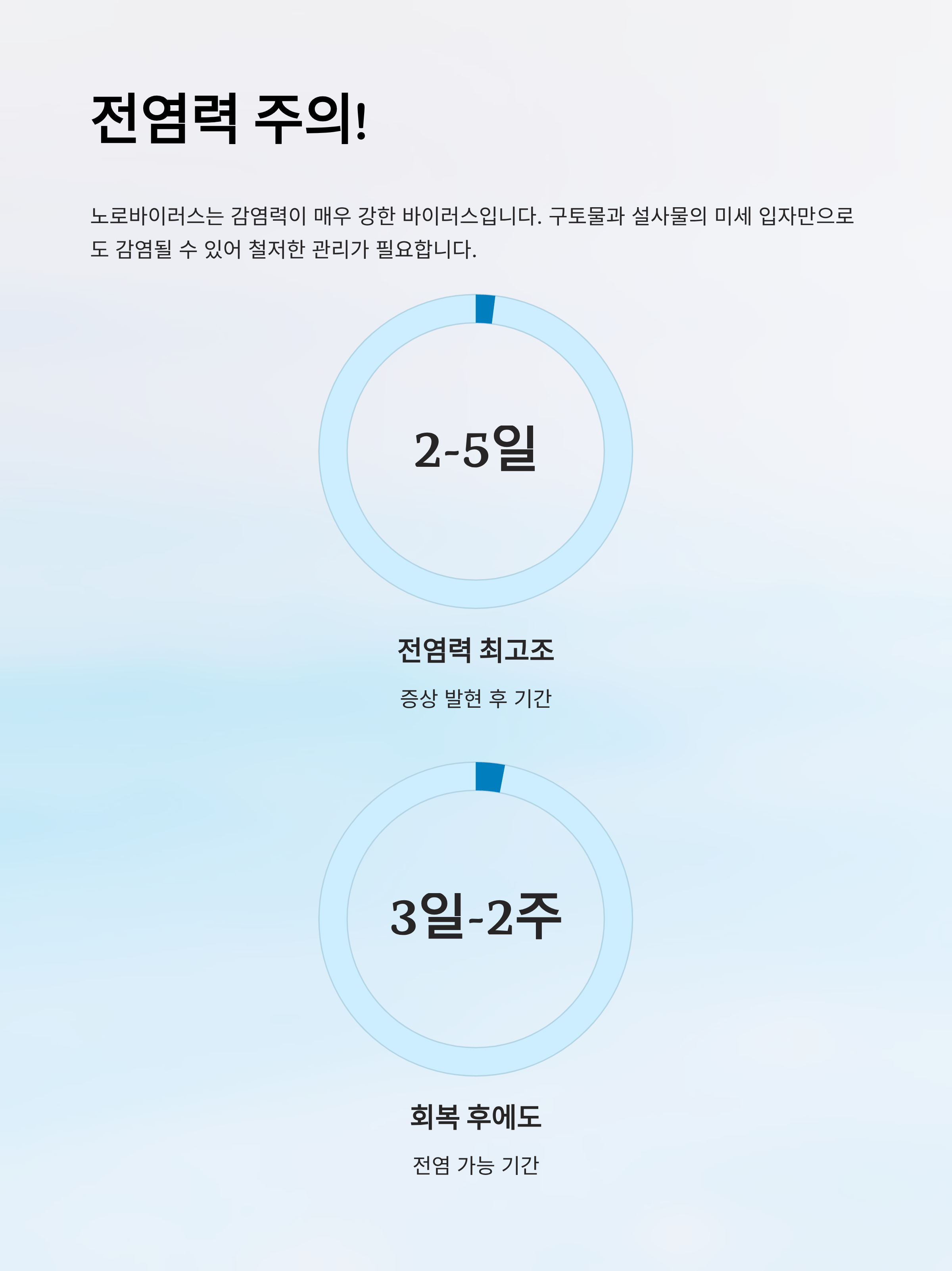 - 노로바이러스는 증상 사라진 후에도 전염력이 남아 있기 때문에,