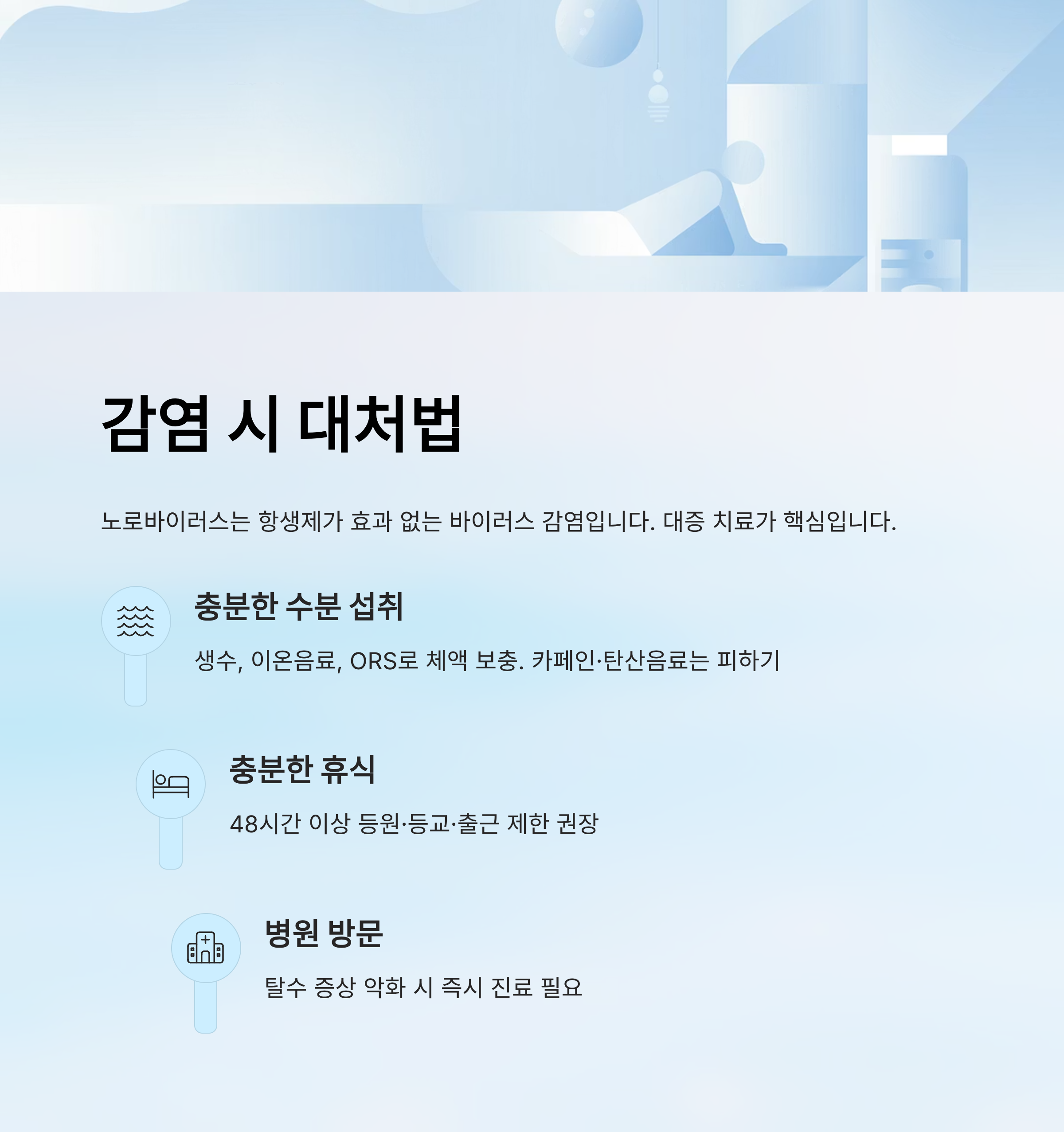 - 구토와 설사로 체액 손실이 심하므로 생수, 이온음료, ORS(수분·전해질 보충액) 섭취가 필수