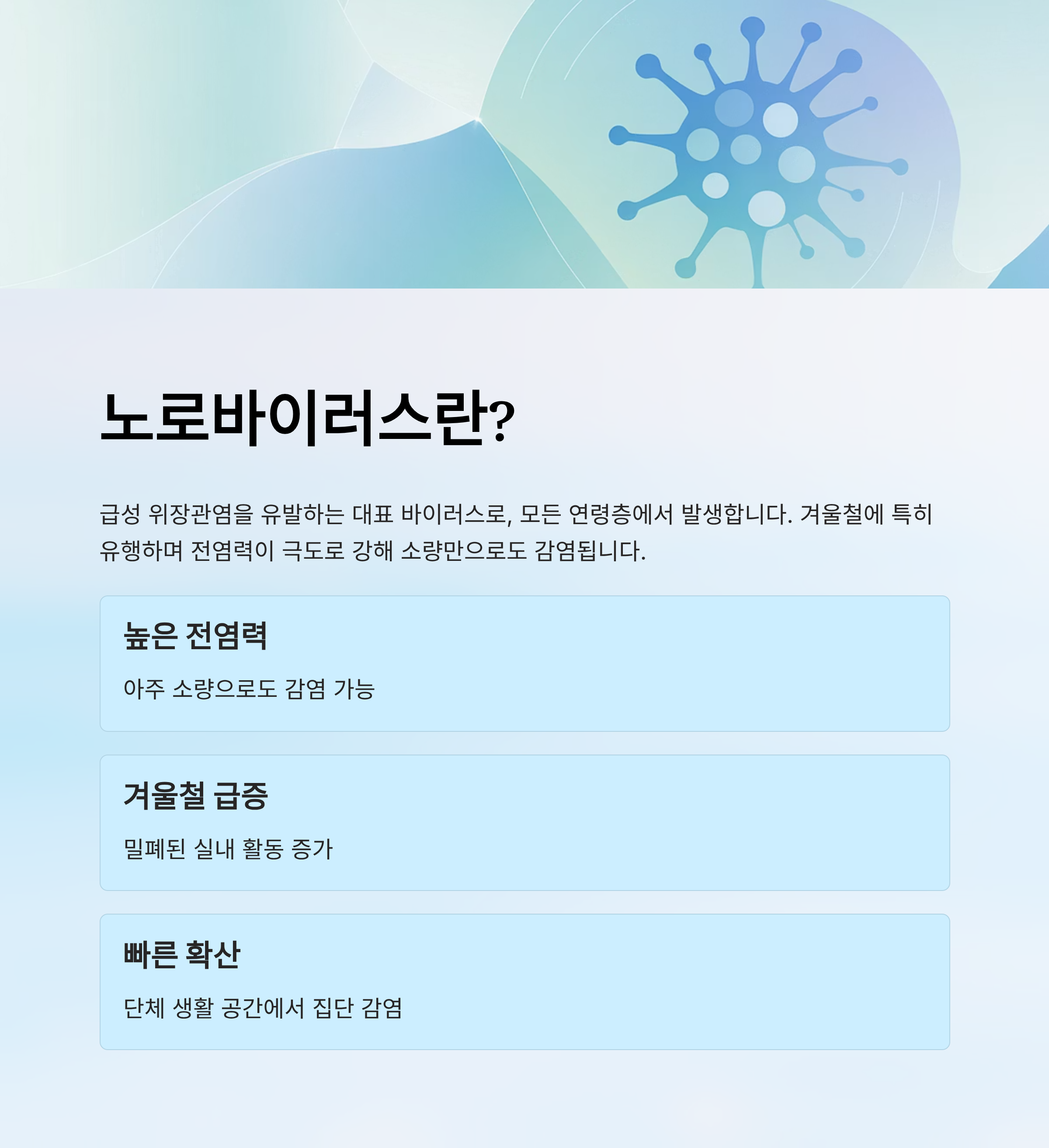 노로바이러스는 겨울철에 급증하는 급성 장염의 대표 원인으로, 전염력이 극도로 강한 바이러스입니다. 아주 소량의 바이러스만으로도 감염될 수 있어 어린이집, 학교, 병원, 요양시설 등 사람 간 접촉이 많은 공간에서 빠르게 확산됩니다. 특히 밀폐된 실내 활동이 늘어나는 겨울철에는 구토·설사 증상을 보이는 환자가 증가하므로 각별한 주의가 필요합니다.