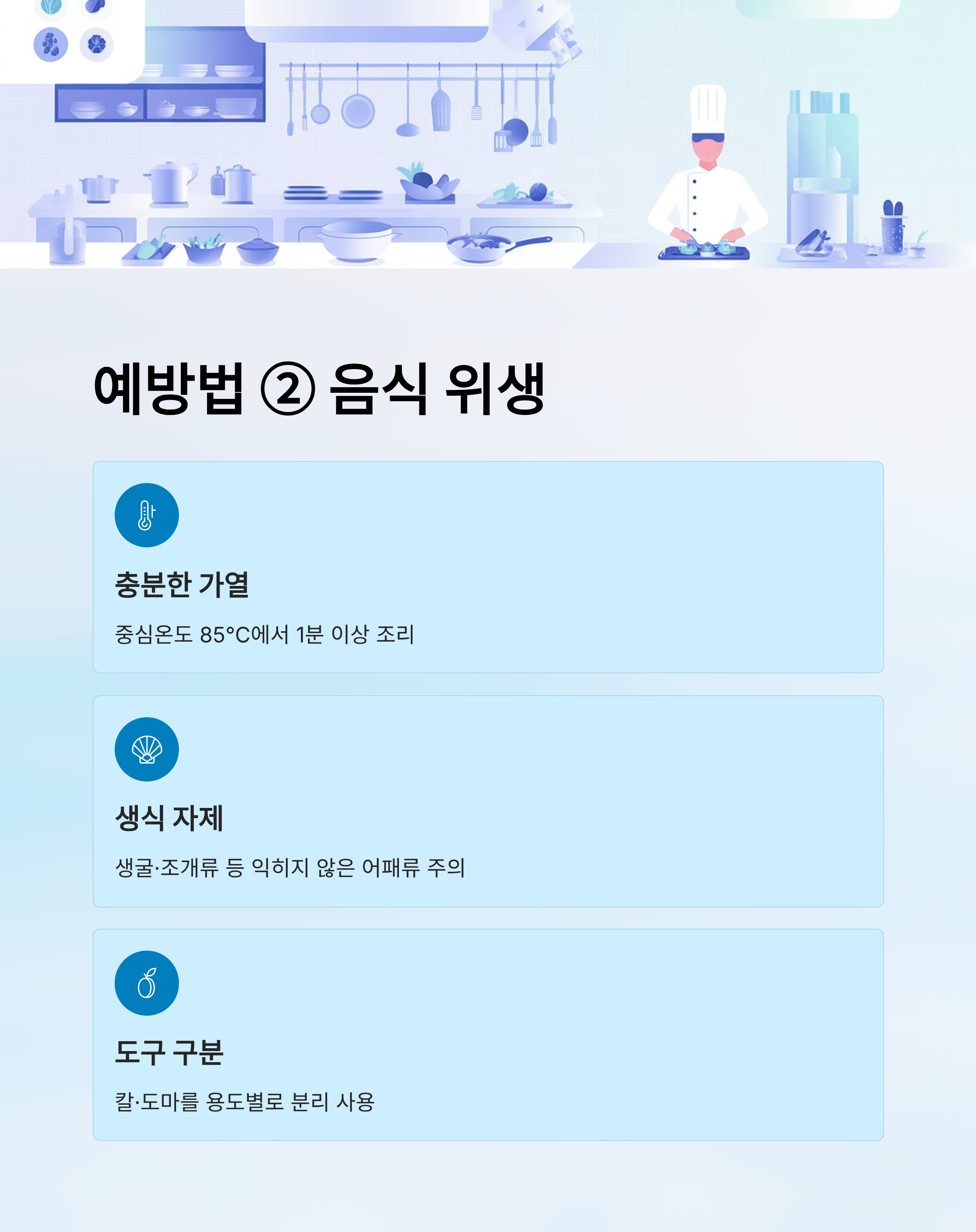 - 칼·도마를 생선·육류·채소용으로 구분 사용