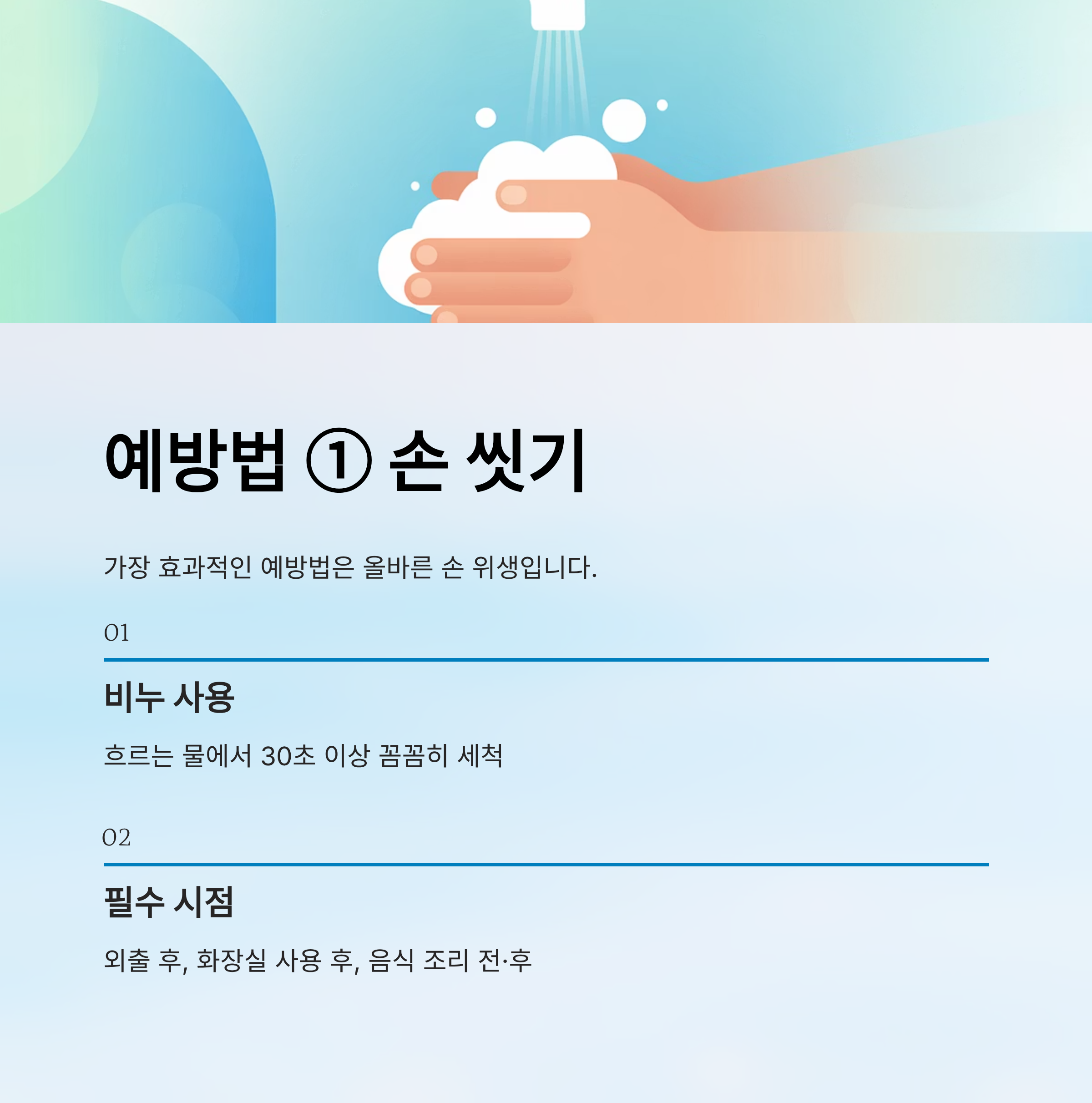 - 비누를 이용해 흐르는 물에서 30초 이상 꼼꼼히 세척