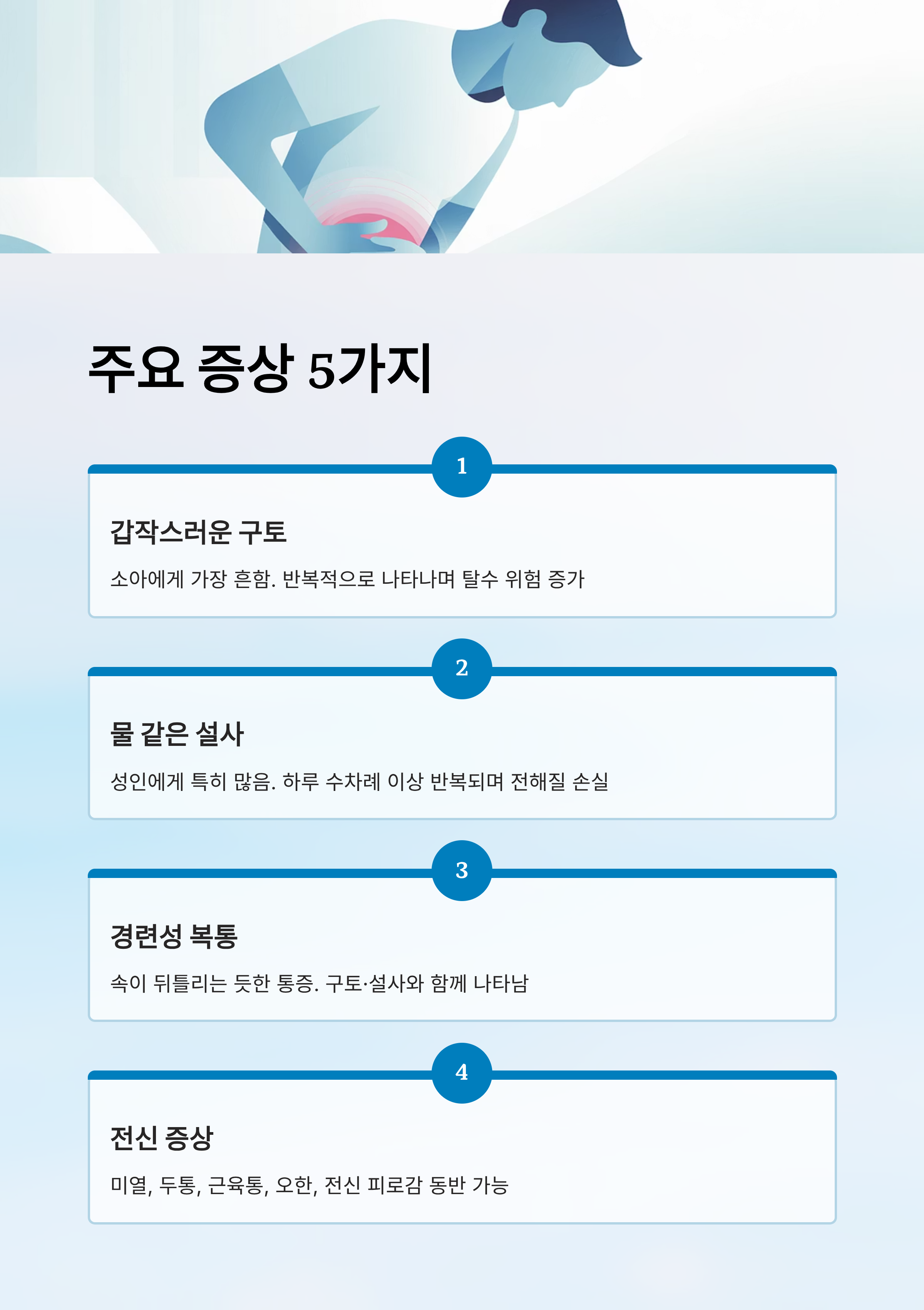 성인에게서 특히 많이 나타나며, 물처럼 묽은 설사가 하루 수차례 이상 반복됩니다. 체내 수분과 전해질 손실이 커지기 때문에 주의가 필요합니다.
