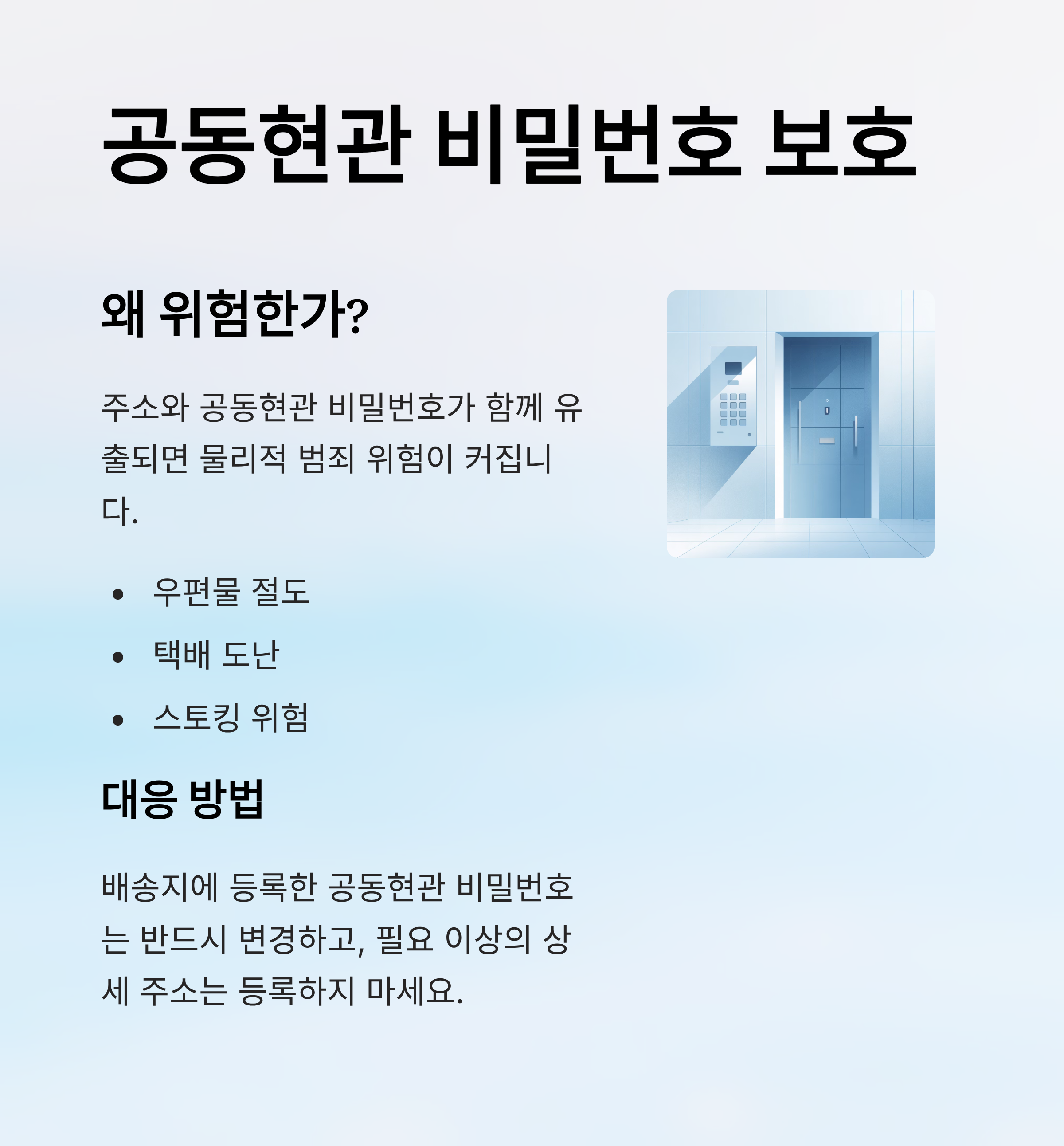 → 주소와 공동현관 비밀번호 노린 범죄 가능.