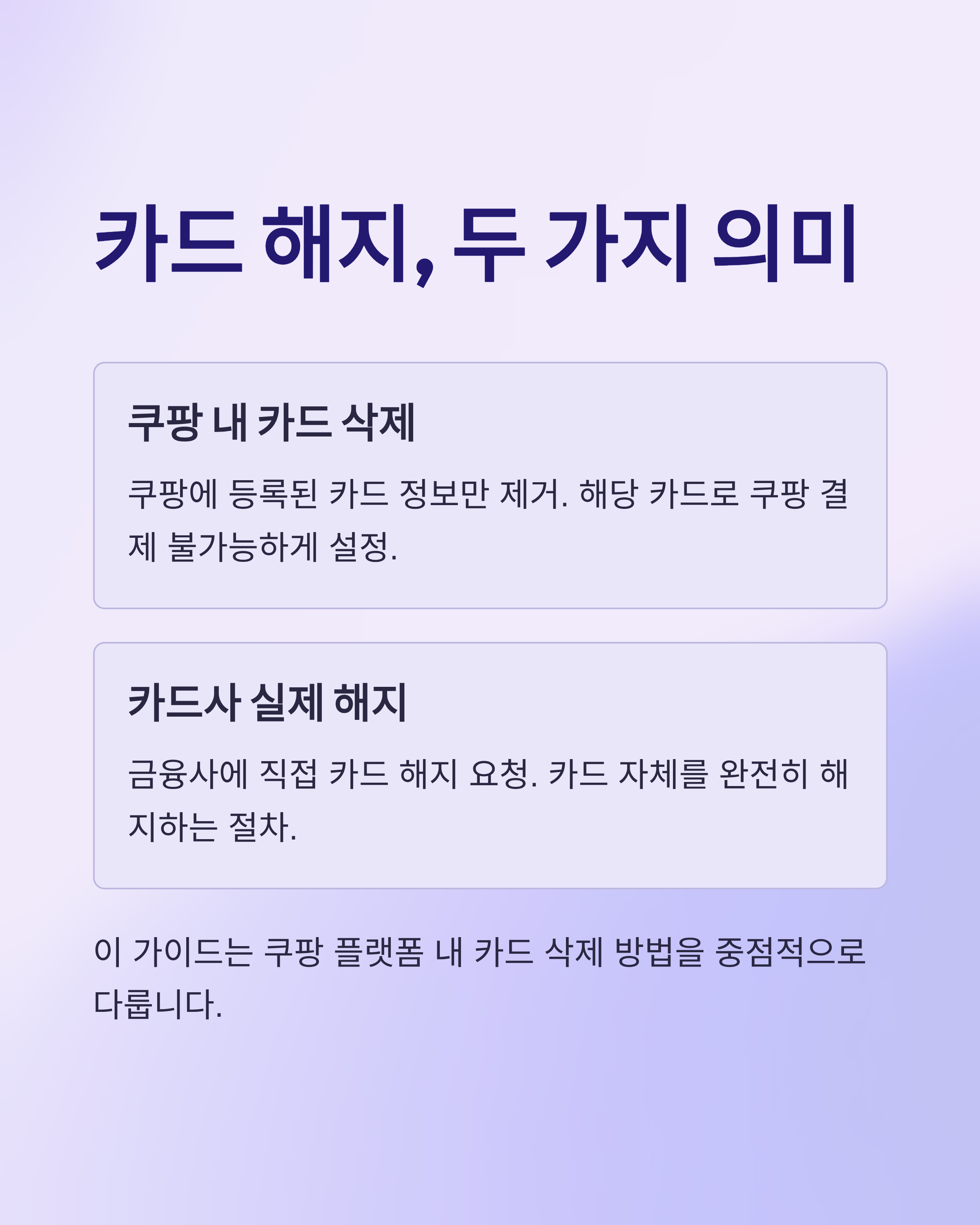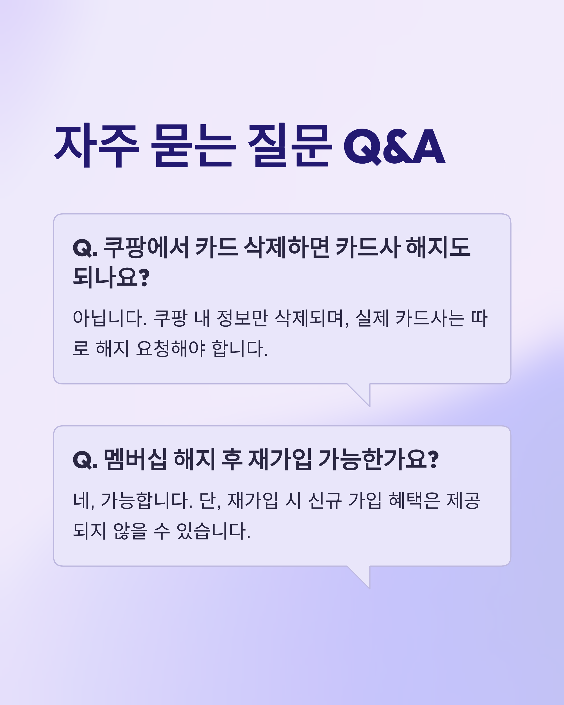 Q. 쿠팡에 등록된 카드를 삭제하면 카드사 해지가 되나요? A. 아닙니다. 쿠팡 내 정보만 삭제되며, 실제 카드사는 따로 해지 요청해야 합니다.