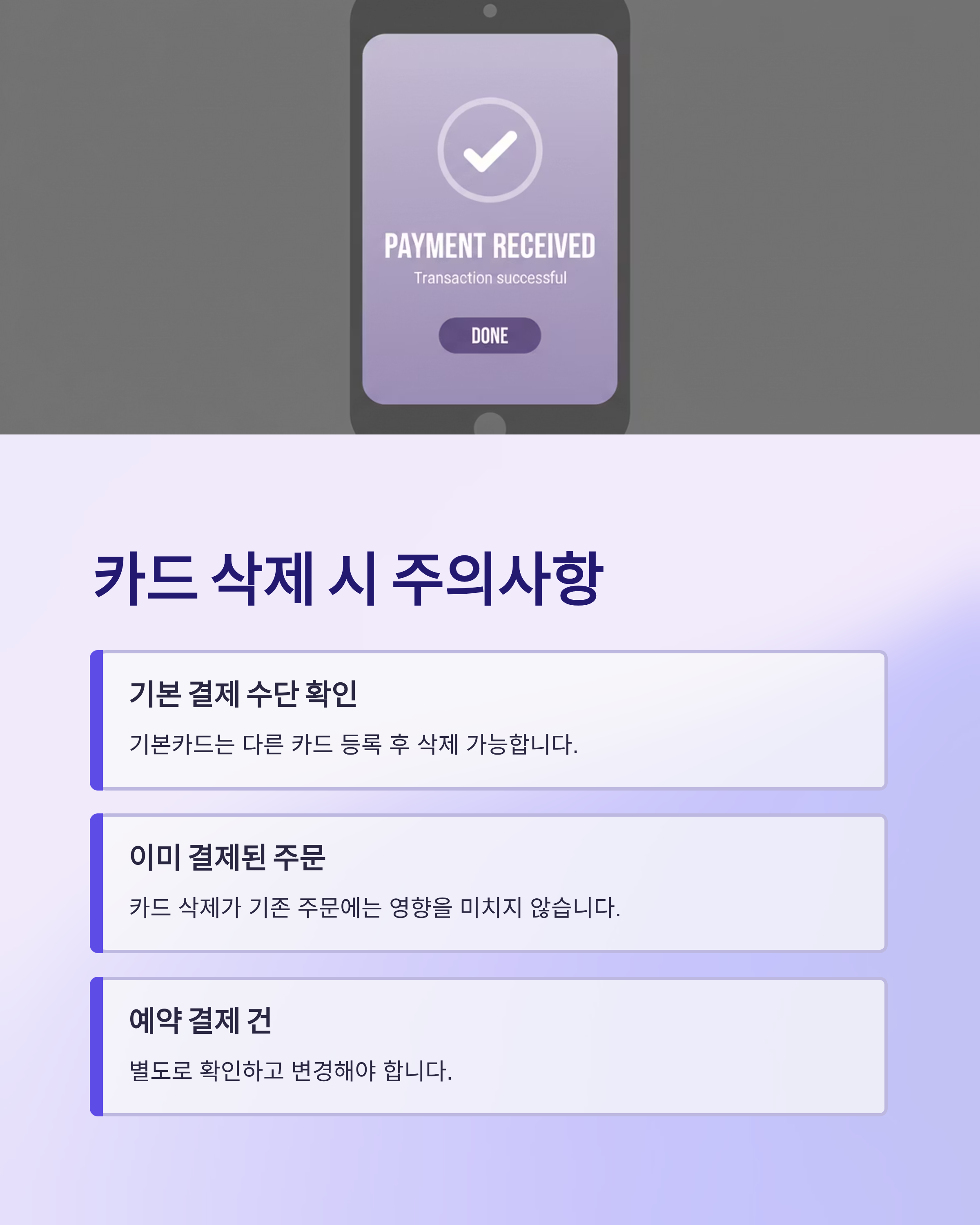 삭제 완료 확인 삭제 후에는 해당 카드로 자동결제 또는 신규 결제가 불가능합니다.
