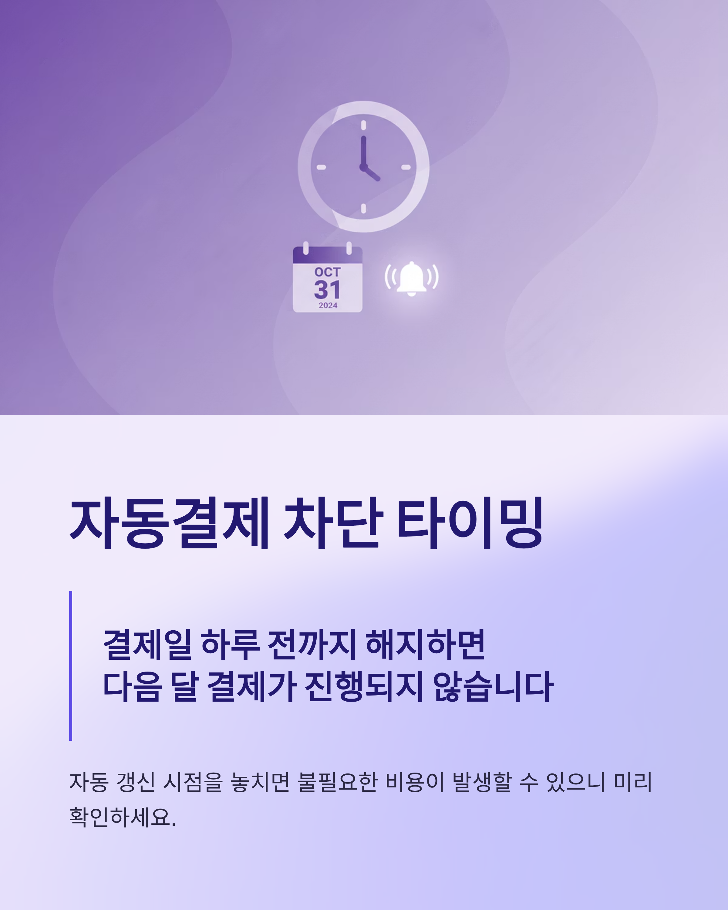 Q. 자동결제를 막기 위해서는 언제까지 해지해야 하나요? A. 결제일 하루 전까지 해지하면 다음 달 결제가 진행되지 않습니다.