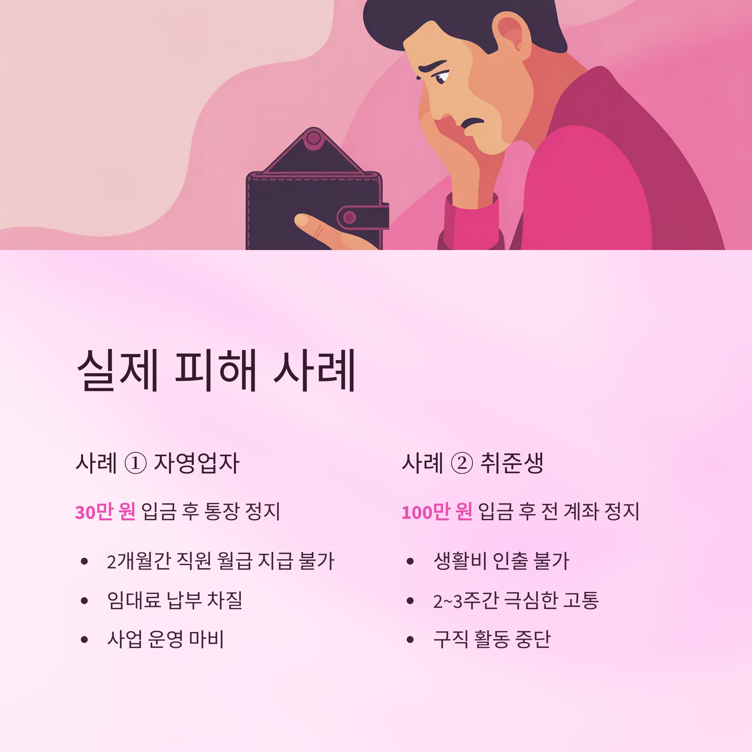 - 쇼핑몰 계좌에 30만 원 입금 후 통장 정지 → 2개월간 직원 월급·임대료 지급 못함