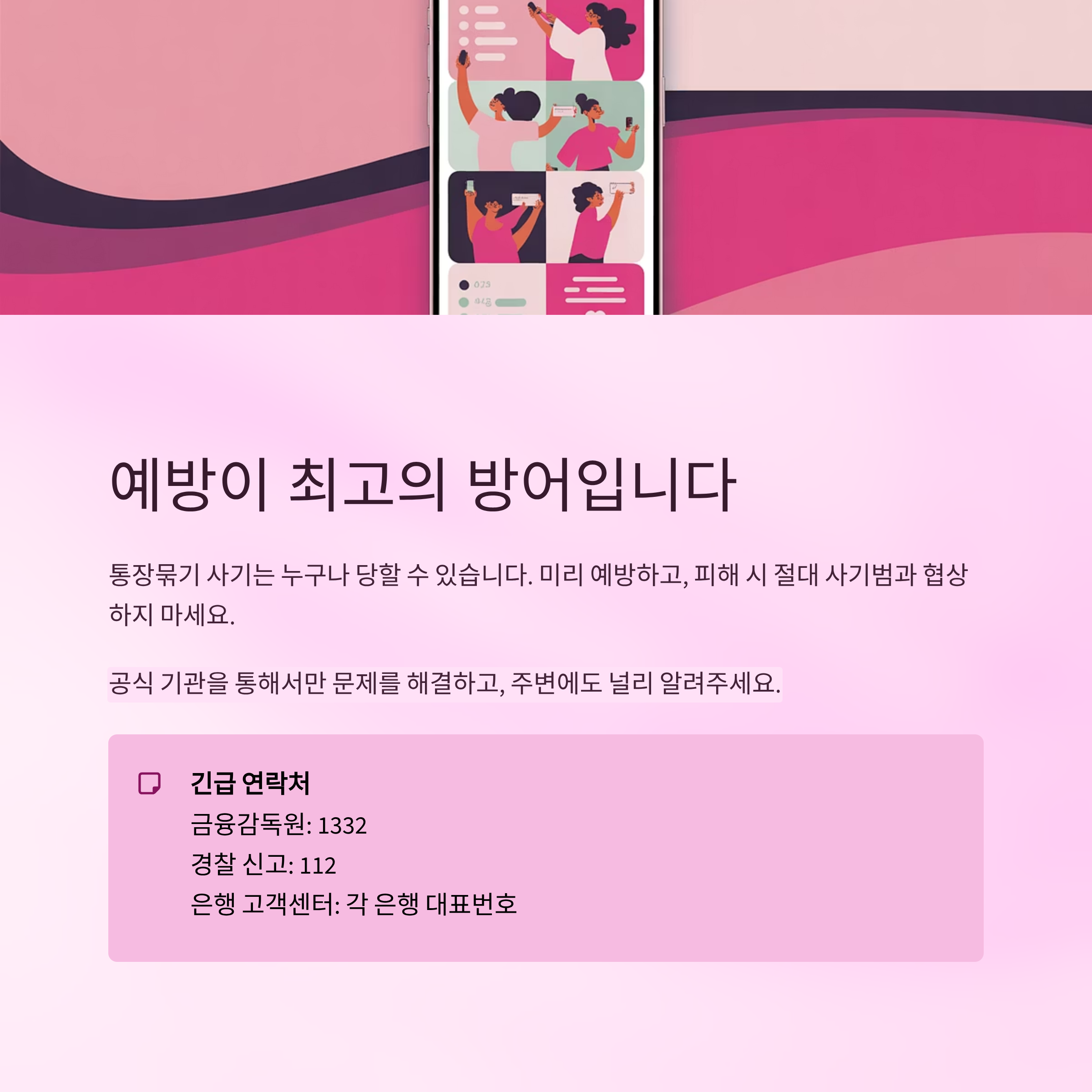 통장묶기 사기는 누구나 당할 수 있습니다. 중요한 것은 미리 예방하고, 피해 시 절대 사기범과 협상하지 않는 것입니다. 공식 기관을 통해만 문제를 해결하고, 주변에도 널리 알려주세요.