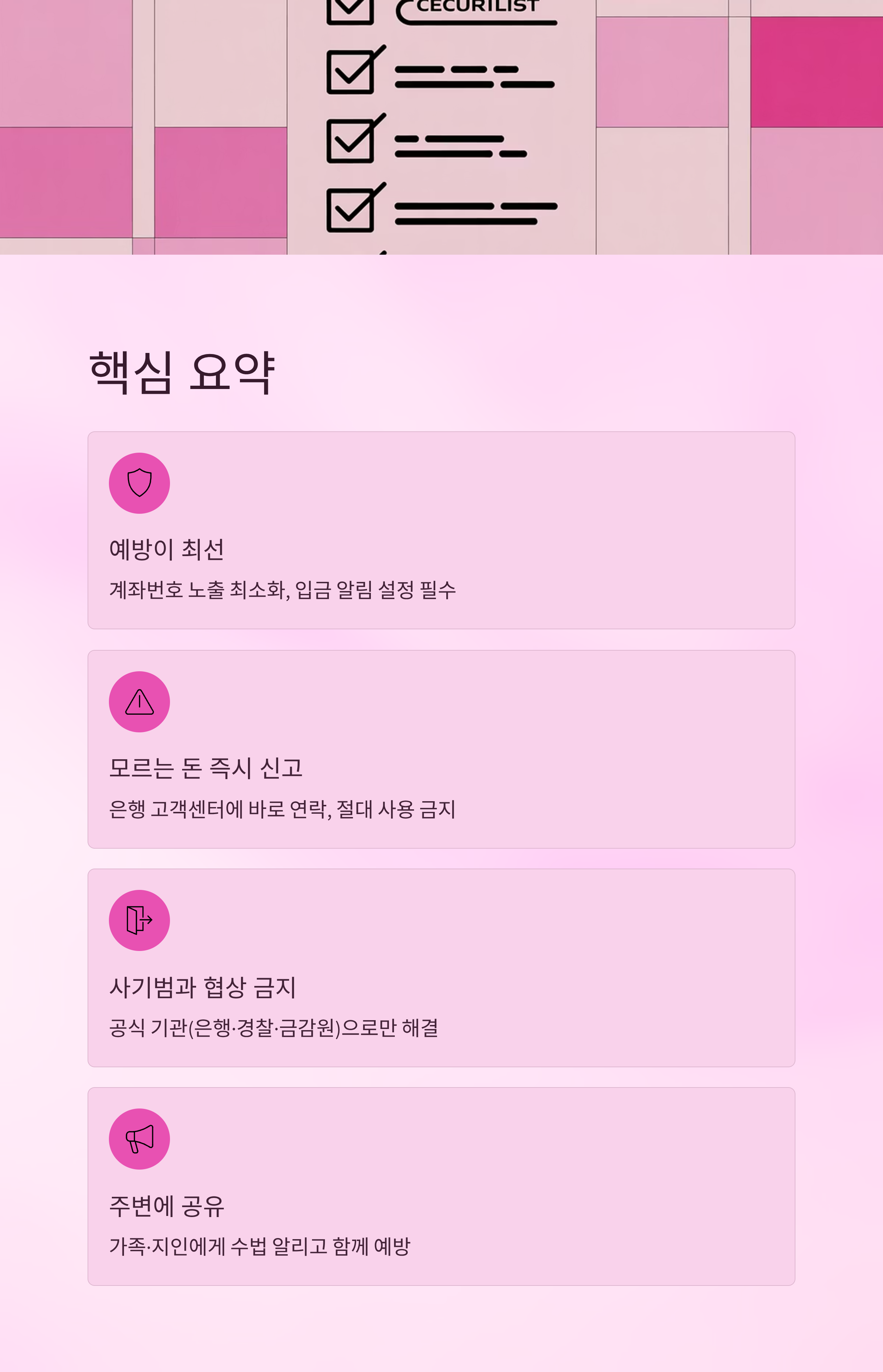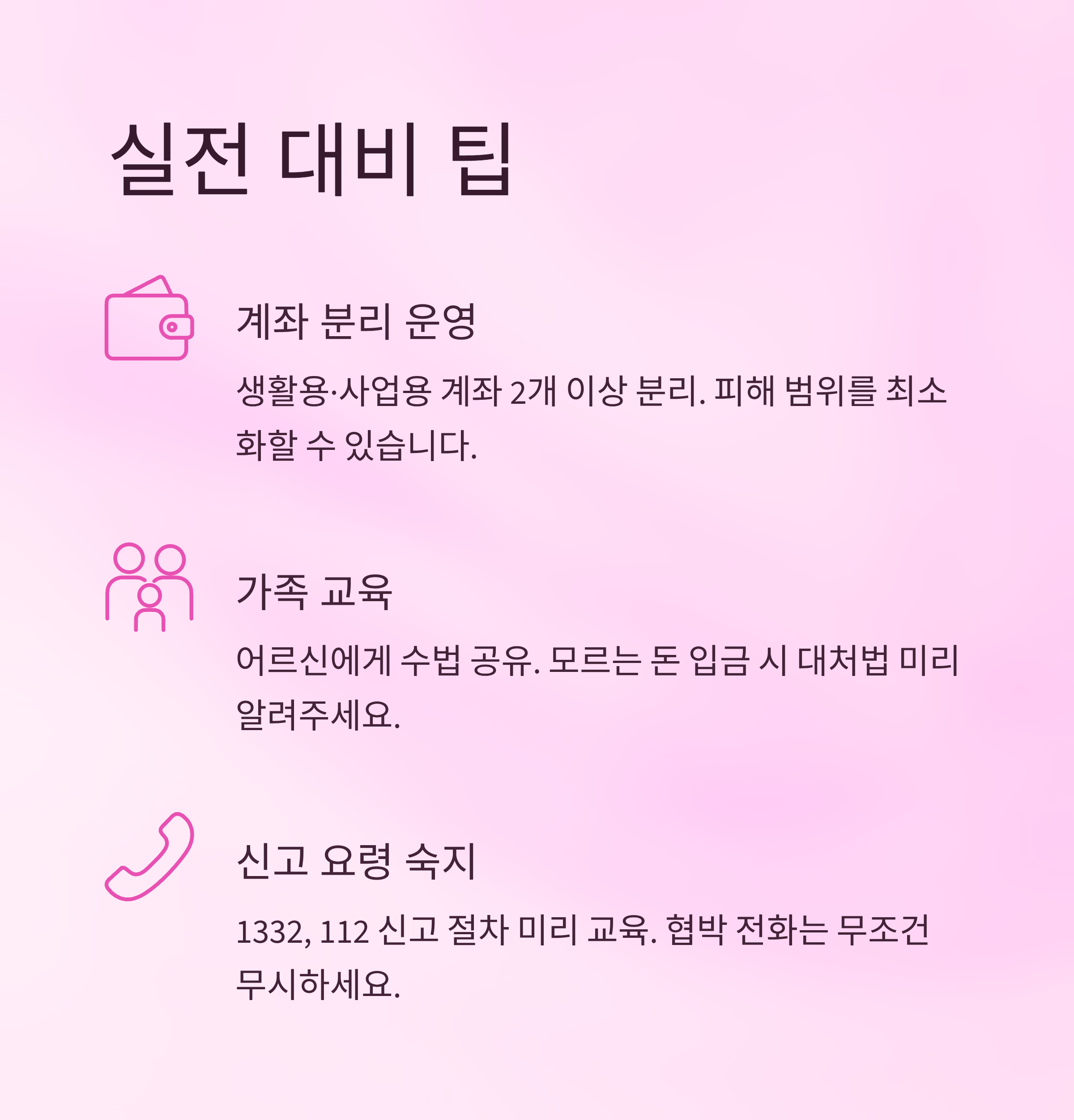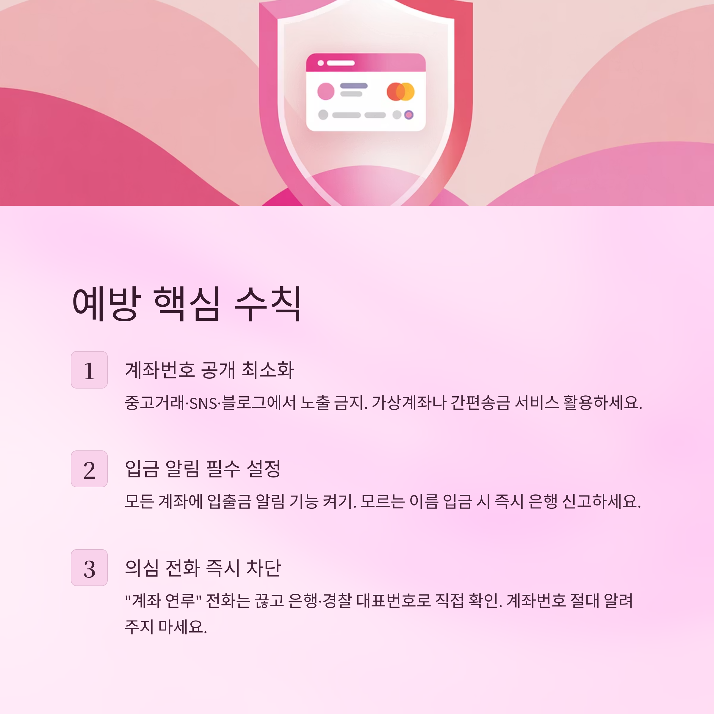 - 중고거래, SNS, 블로그 등에서 계좌번호 노출 금지