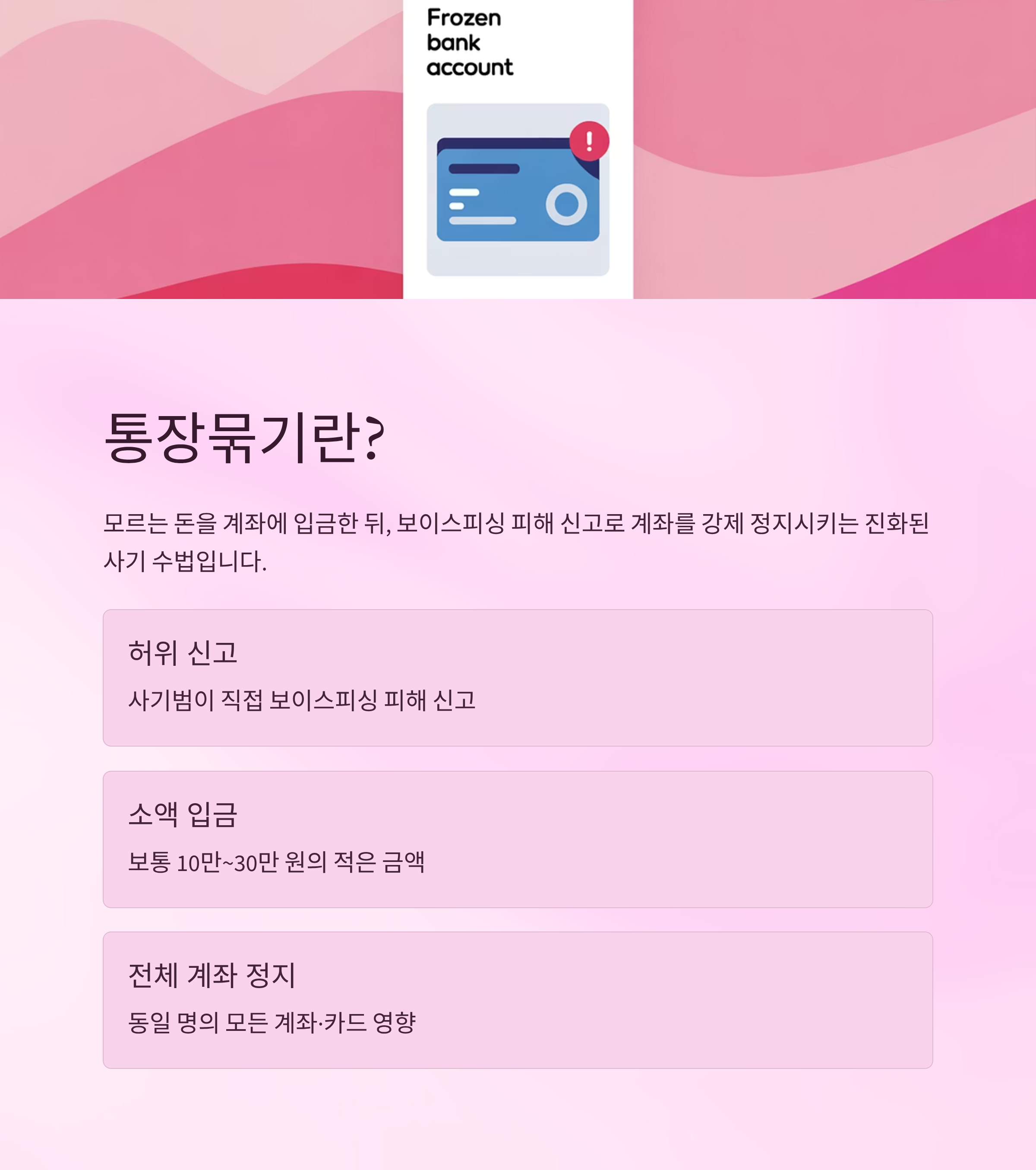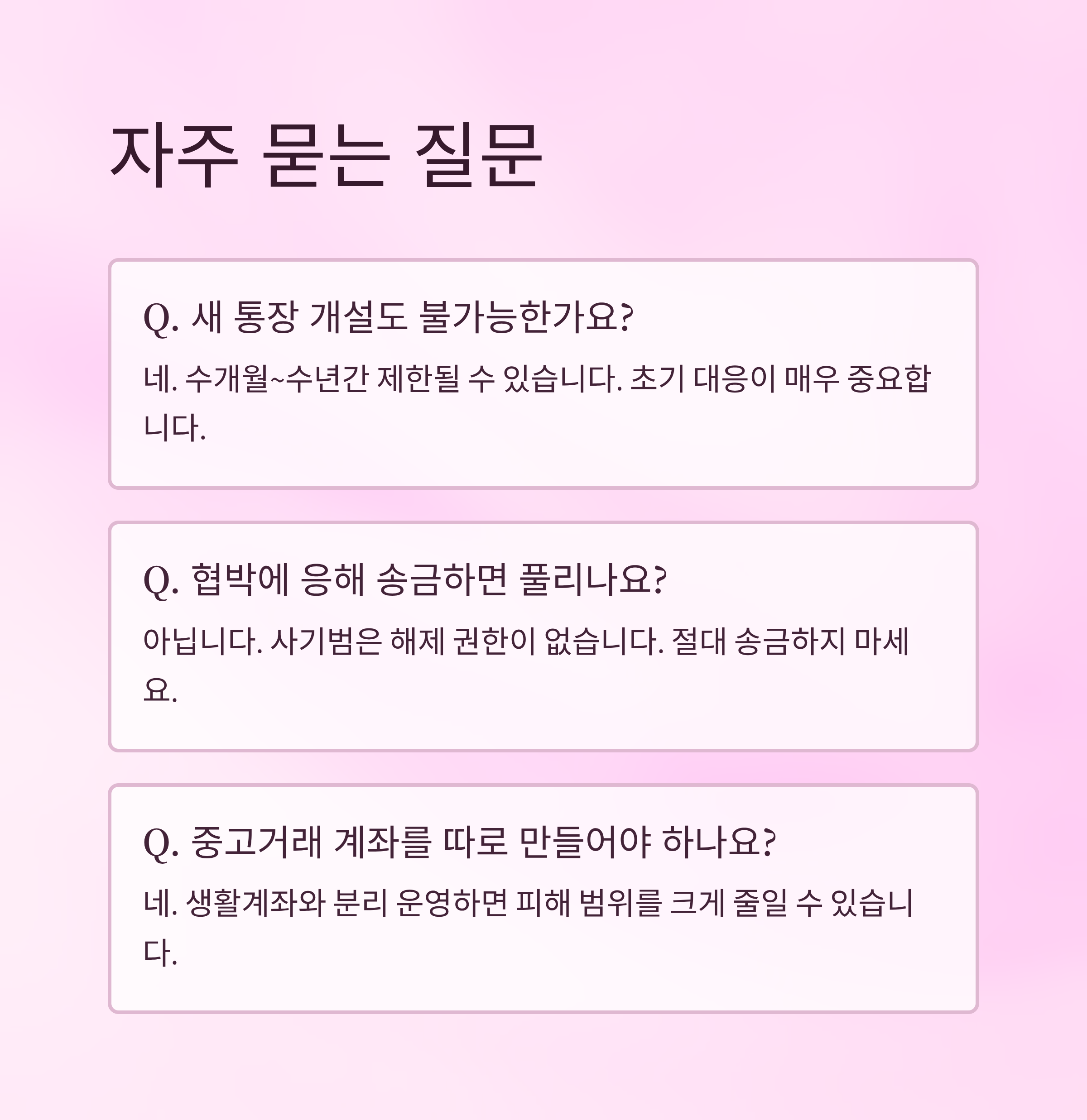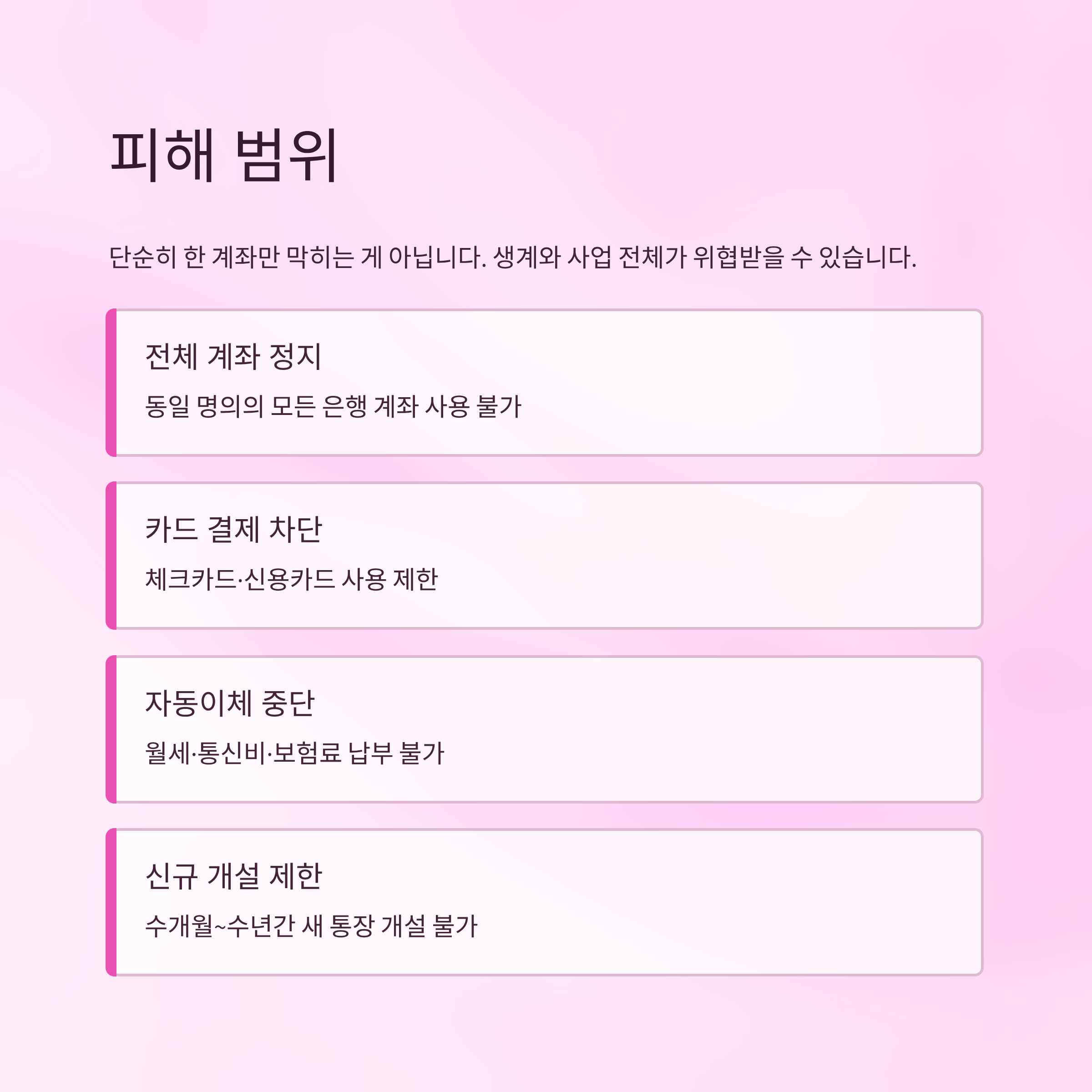 - 계좌 정지 범위: 해당 계좌뿐만 아니라 동일 명의 전체 계좌, 카드, 자동이체까지 광범위하게 영향