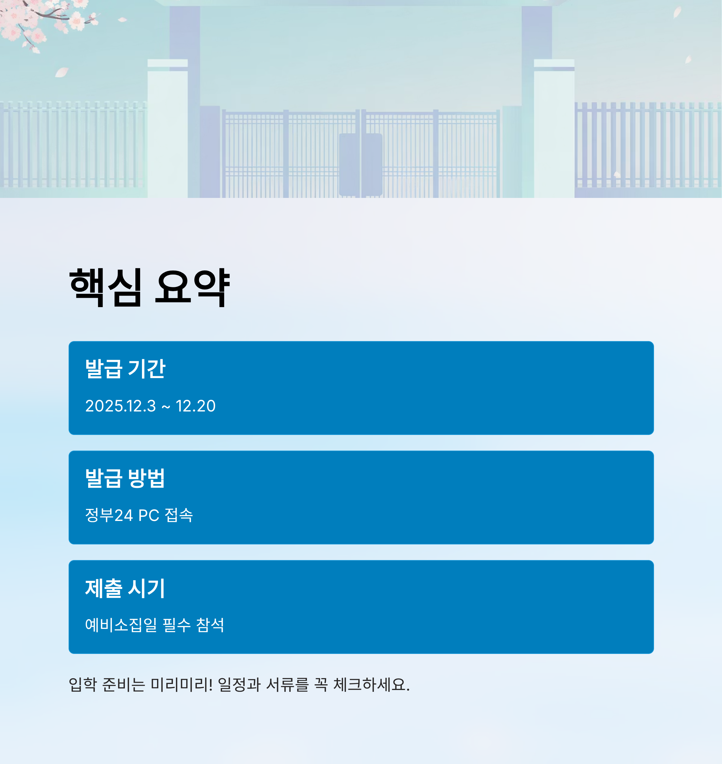입학 준비는 미리미리 진행해 두면 불필요한 번거로움을 줄일 수 있으니, 일정과 서류를 꼭 체크해 두세요.