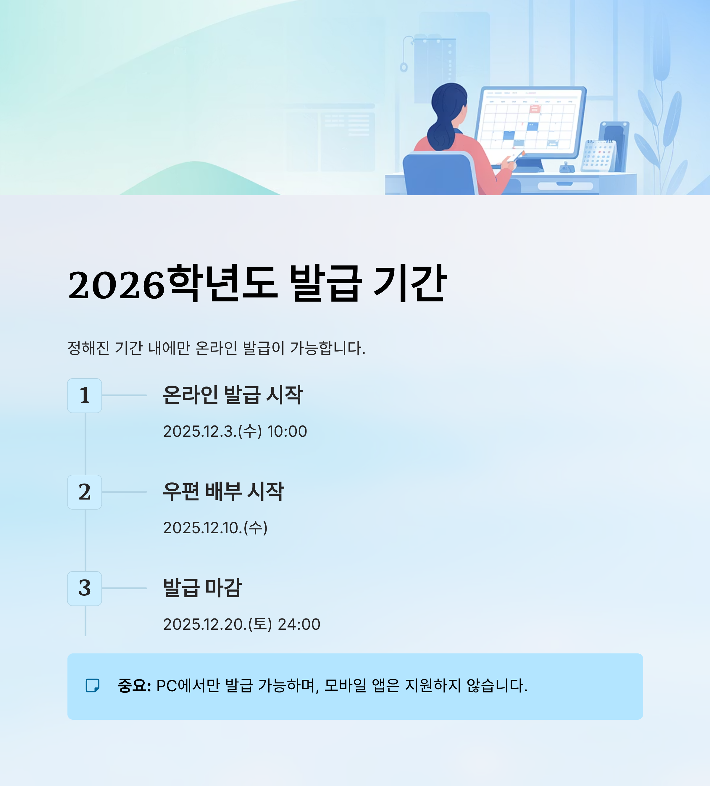 | 우편/인편 배부 | 2025.12.10.(수) ~ 12.20.(토) | 온라인 발급 후에도 우편 발송됨 |