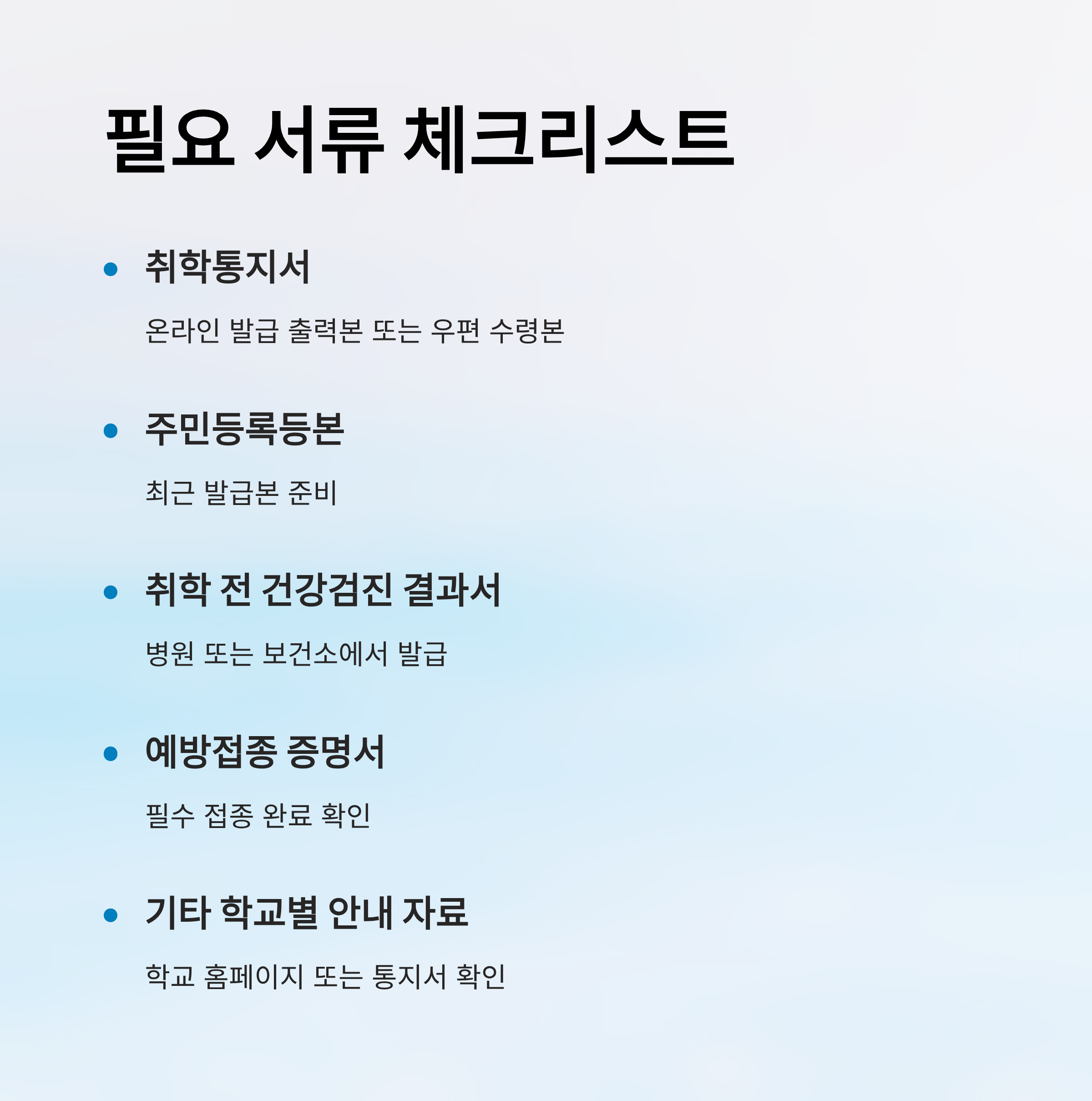 - 필요한 서류(취학통지서, 주민등록등본, 건강검진서 등)