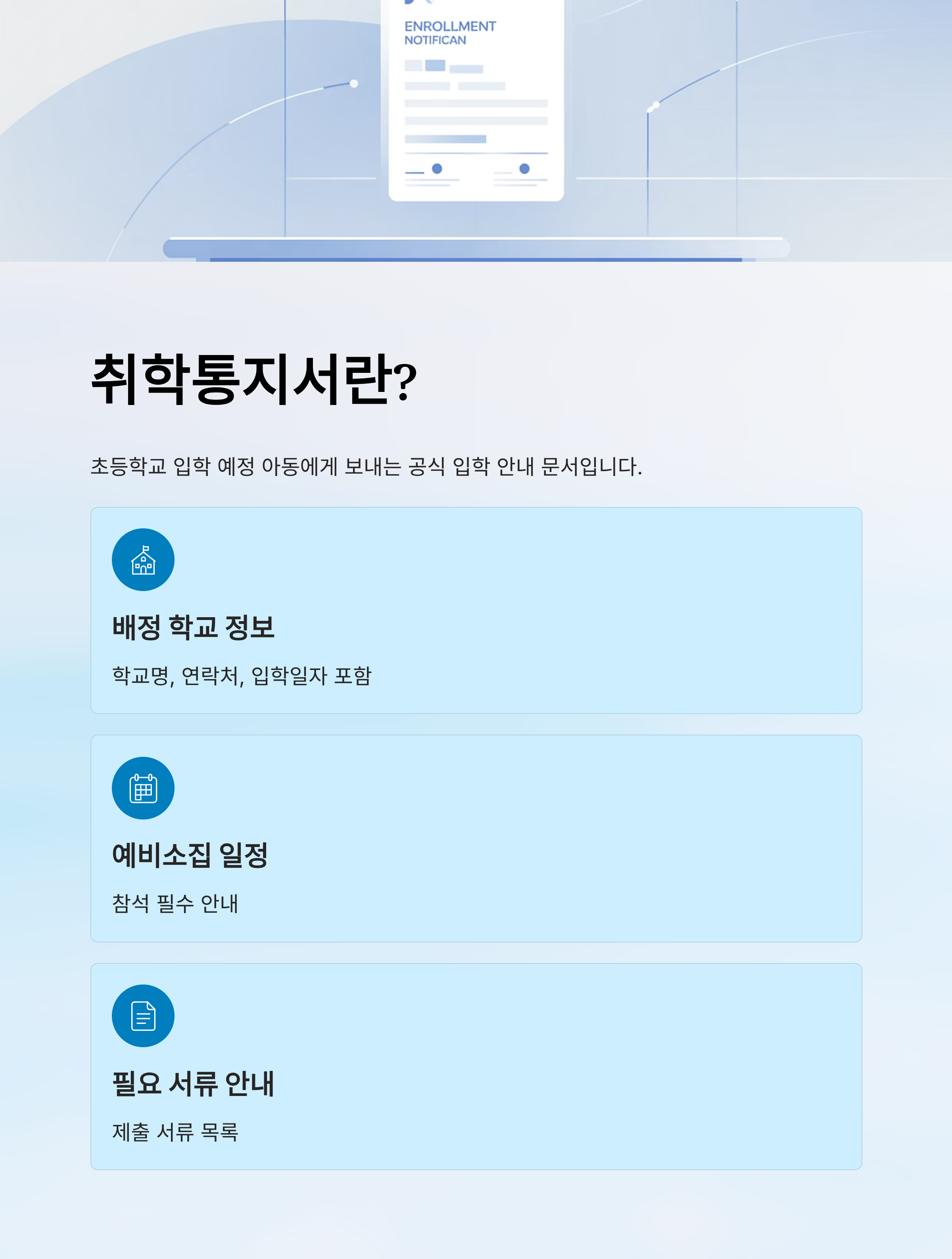 취학통지서는 관할 행정기관이 초등학교 입학 예정 아동에게 보내는 입학 안내 공식 문서입니다.