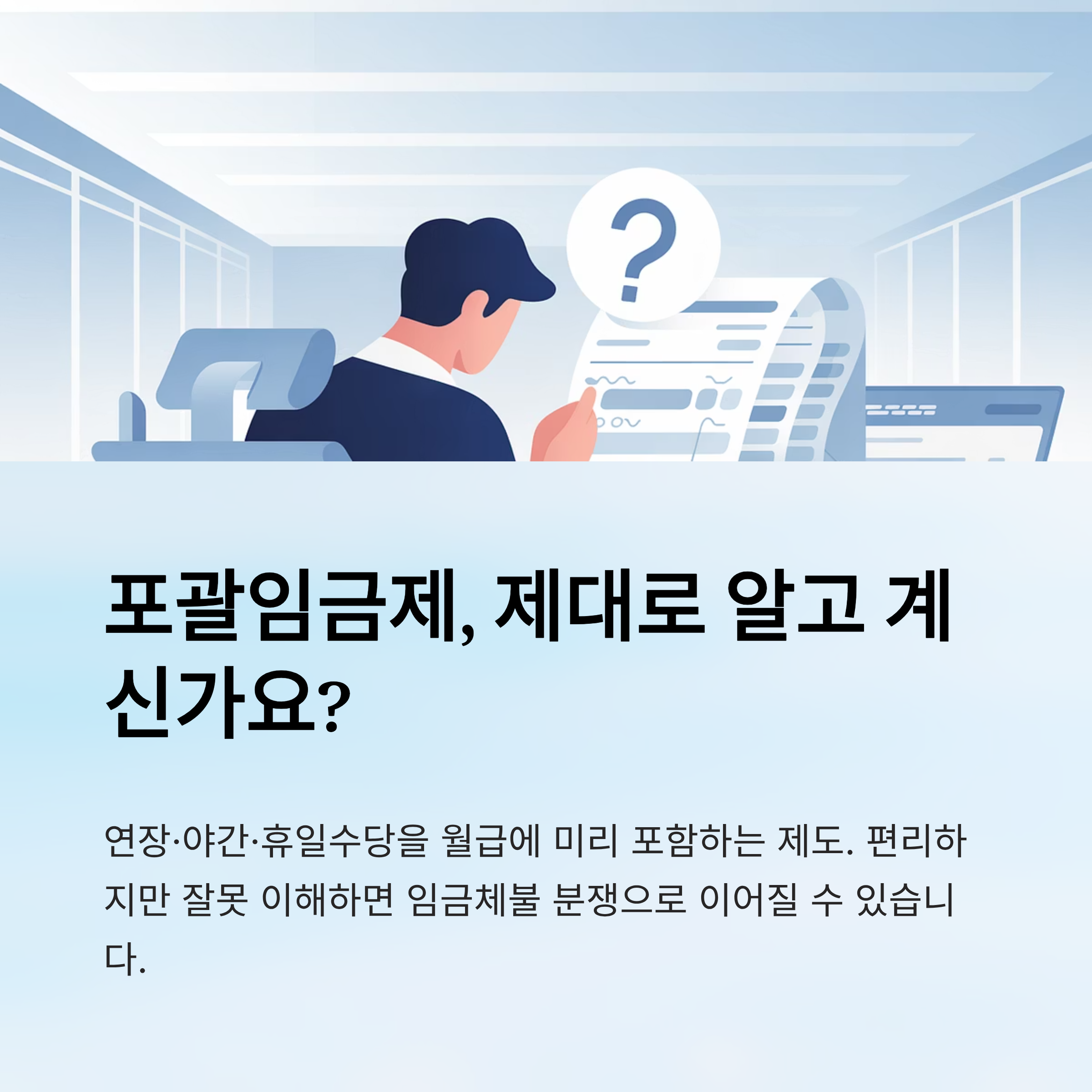 최근 직장인들 사이에서 꾸준히 논란이 되는 제도가 바로 포괄임금제입니다. 연장·야간·휴일근로수당을 별도로 계산하지 않고 월급에 미리 포함해 지급하는 방식으로, 기업과 근로자 모두에게 편리한 측면이 있지만, 제대로 이해하지 못하면 임금체불·근로시간 분쟁으로 이어질 수 있어 주의가 필요합니다.