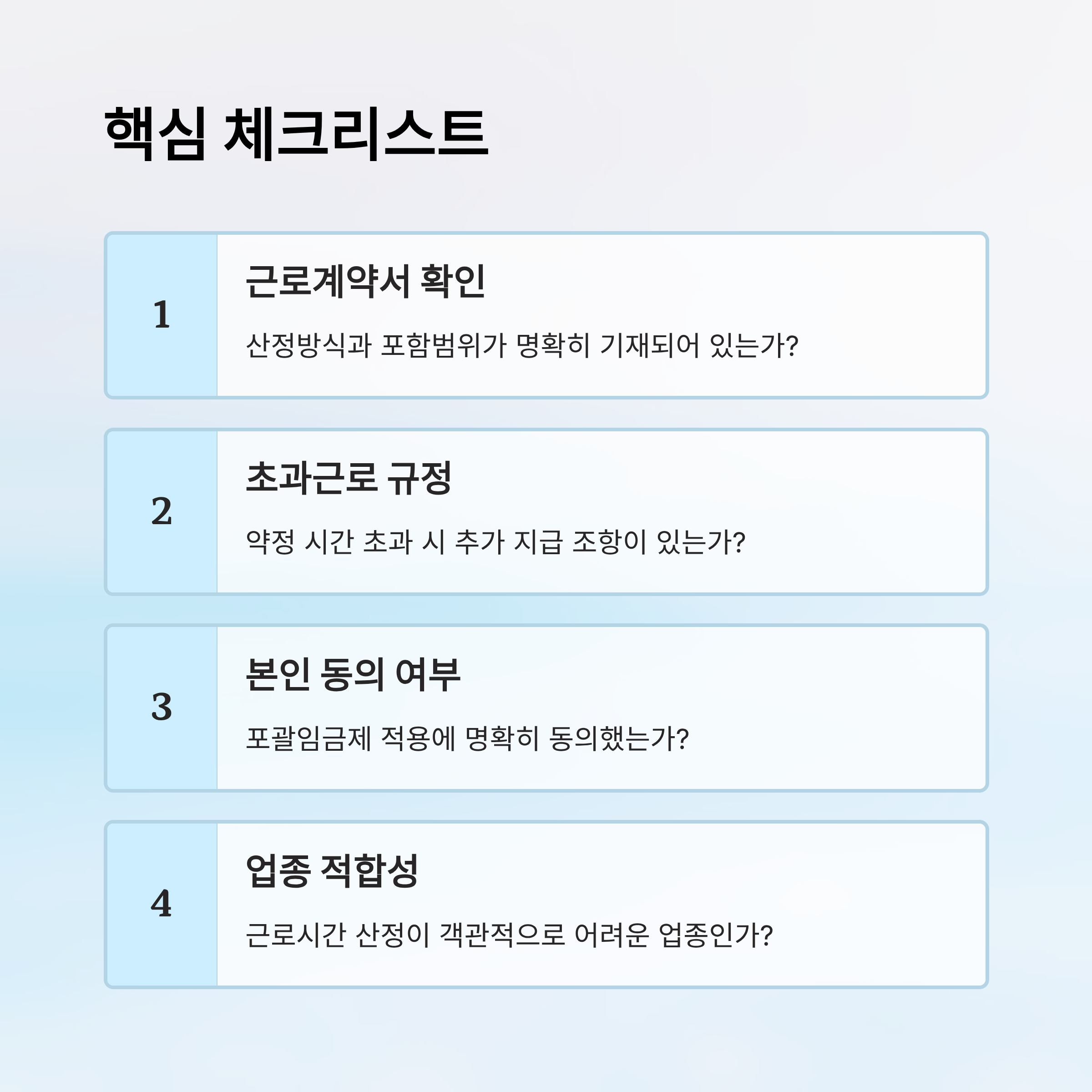 포괄임금제를 정확히 이해하고 근로계약서 내용을 꼼꼼히 확인해야만 임금 분쟁을 예방할 수 있습니다.