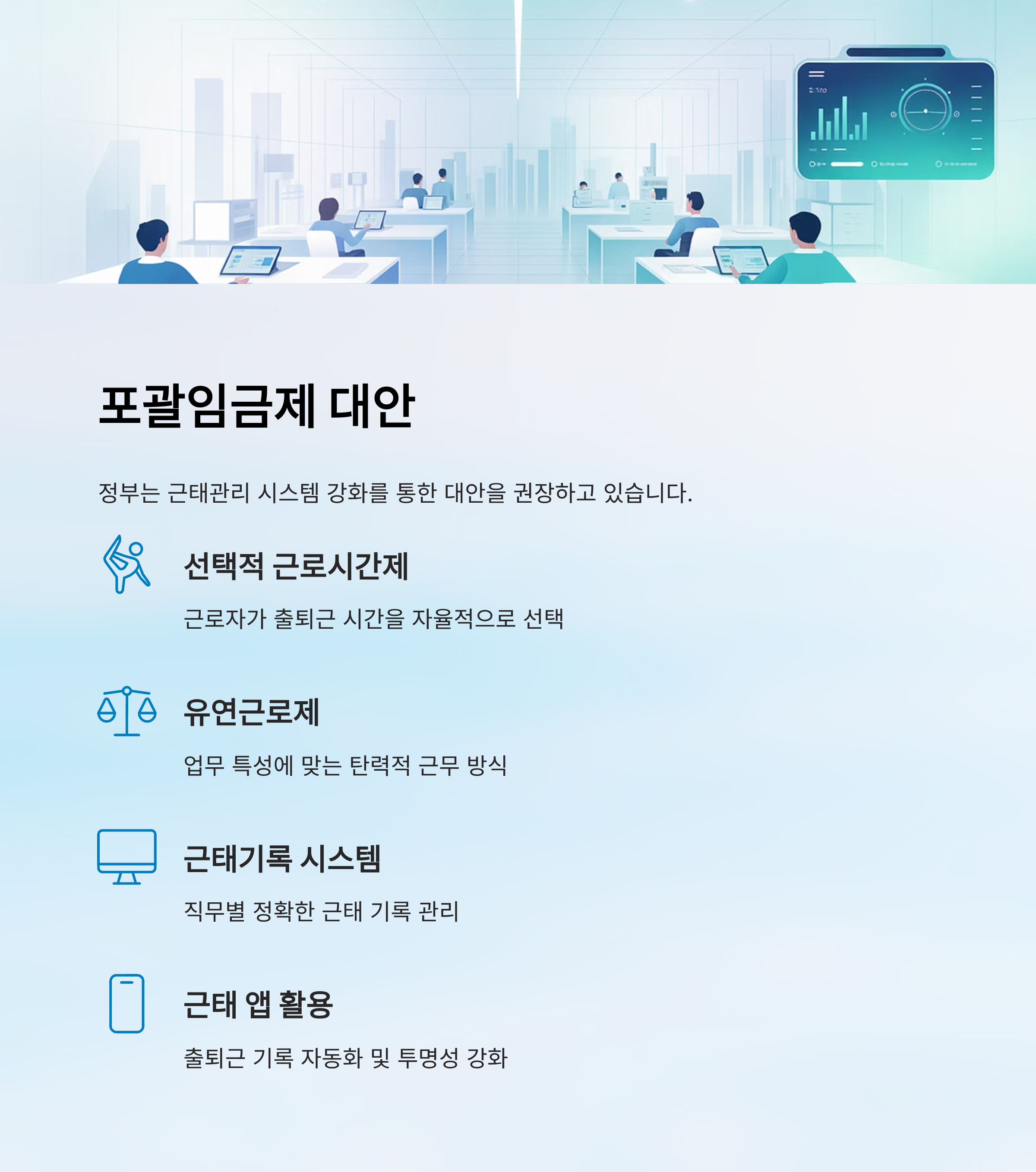최근에는 과도한 노동시간을 감추기 위한 포괄임금제 오남용이 사회적으로 문제 제기되면서, 실근로시간 기록 의무 강화와 제도 폐지 논의도 활발합니다.